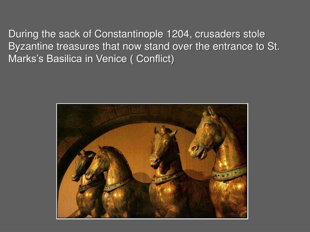 During the sack of Constantinople 1204, crusaders stole Byzantine treasures that now stand over the entrance to St. Marks’s Basilica in Venice ( Conflict)