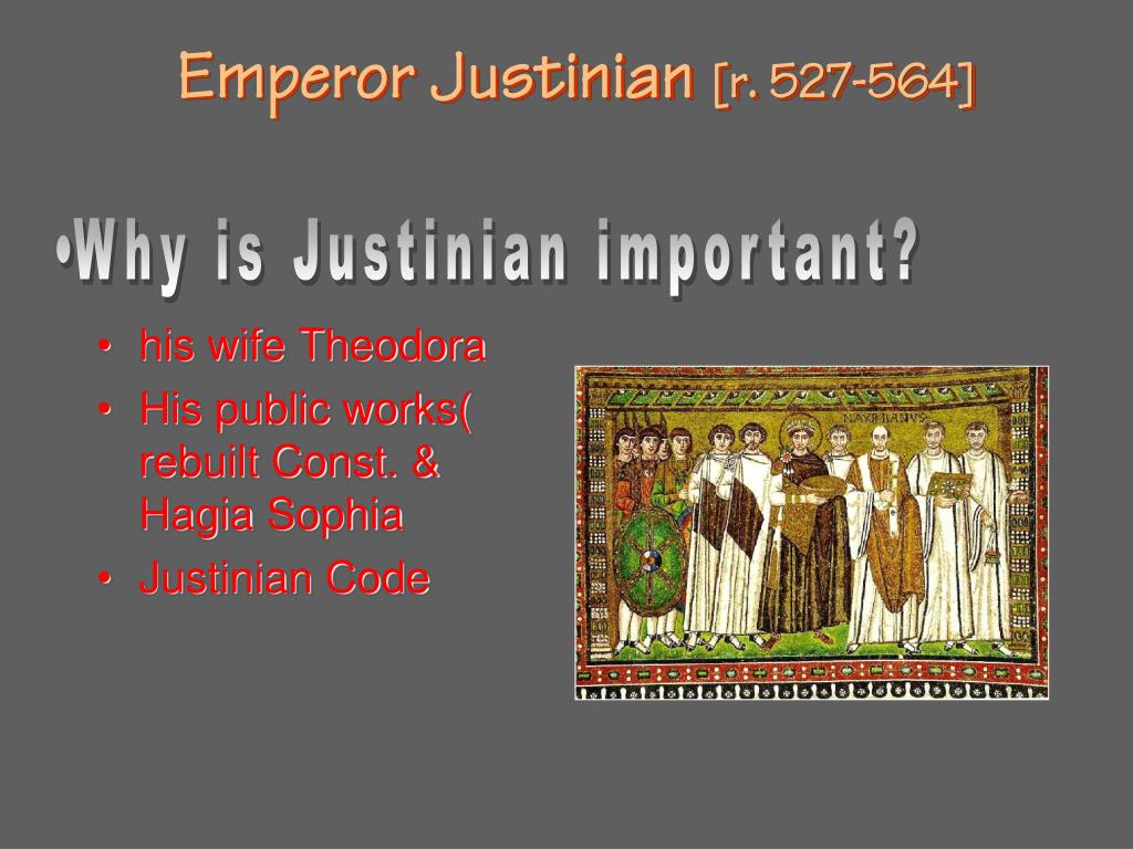Emperor Justinian [r. 527-564] Why is Justinian important? • his wife Theodora • His public works( rebuilt Const. & Hagia Sophia • Justinian Code