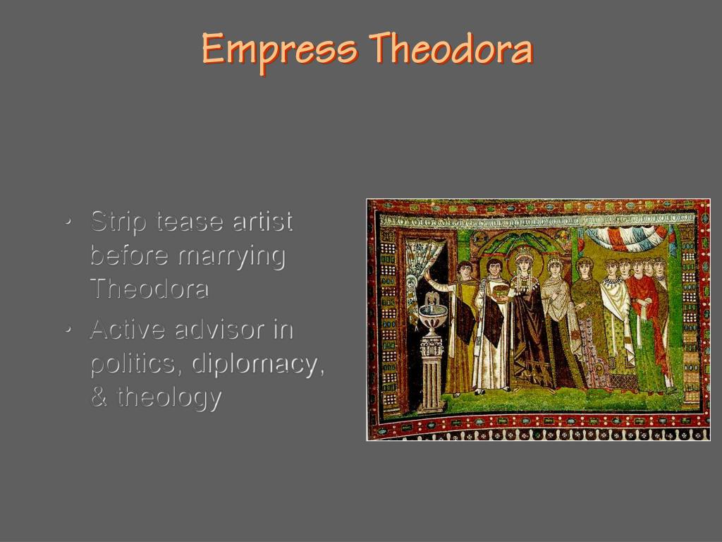 Empress Theodora • Strip tease artist before marrying Theodora • Active advisor in politics, diplomacy, & theology