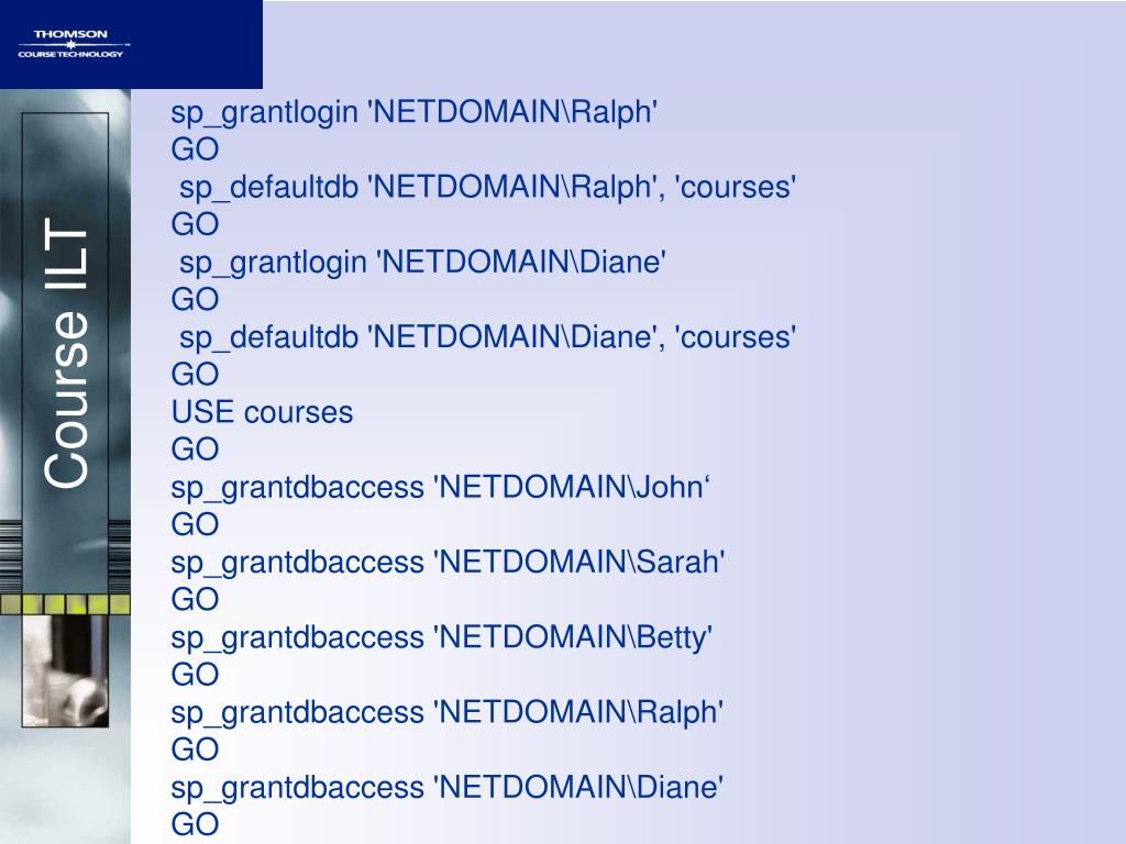 sp_grantlogin 'NETDOMAIN\Ralph' GO sp_defaultdb 'NETDOMAIN\Ralph', 'courses' GO sp_grantlogin 'NETDOMAIN\Diane' GO sp_defaultdb 'NETDOMAIN\Diane', 'courses' GO USE courses GO sp_grantdbaccess 'NETDOMAIN\John‘ GO sp_grantdbaccess 'NETDOMAIN\Sarah' GO sp_grantdbaccess 'NETDOMAIN\Betty' GO sp_grantdbaccess 'NETDOMAIN\Ralph' GO sp_grantdbaccess 'NETDOMAIN\Diane' GO