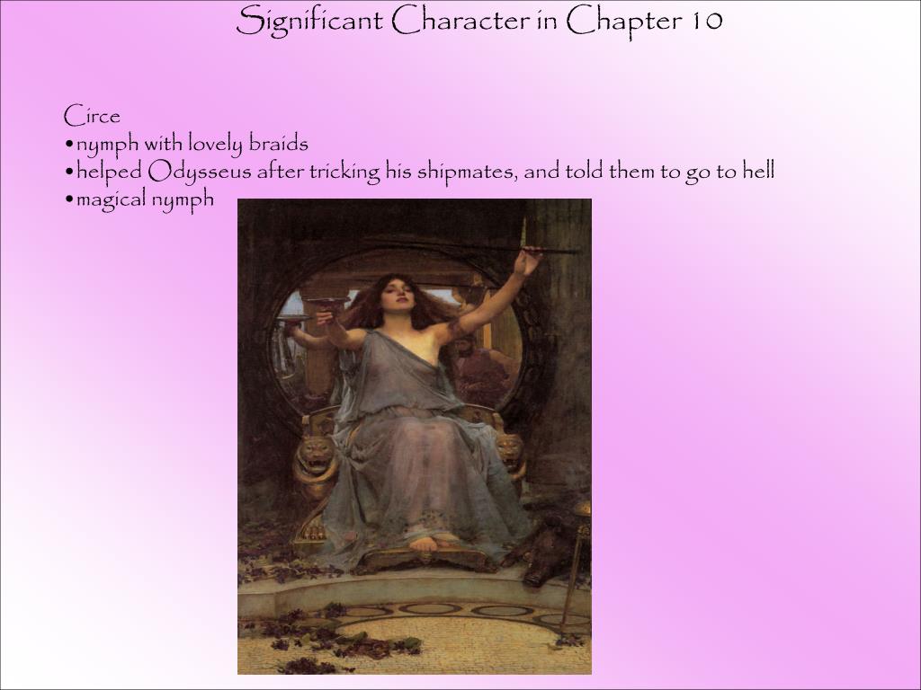 Significant Character in Chapter 10 • Circe • nymph with lovely braids • helped Odysseus after tricking his shipmates, and told them to go to hell • magical nymph