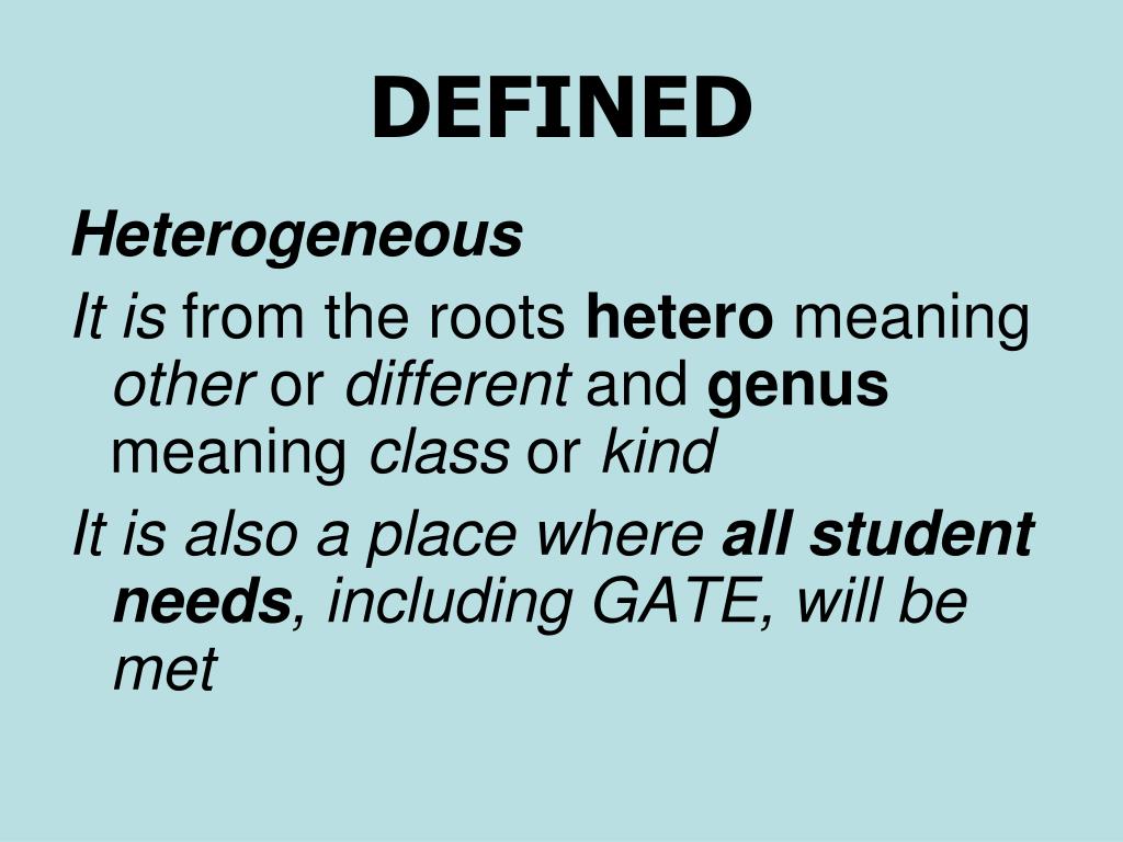 DEFINED Heterogeneous It is from the roots hetero meaning other or different and genus meaning class or kind It is also a place where all student needs, including GATE, will be met