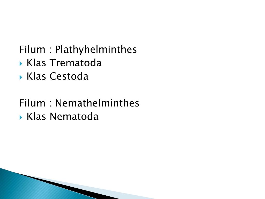 Filum : Plathyhelminthes • Klas Trematoda • Klas Cestoda Filum : Nemathelminthes • Klas Nematoda