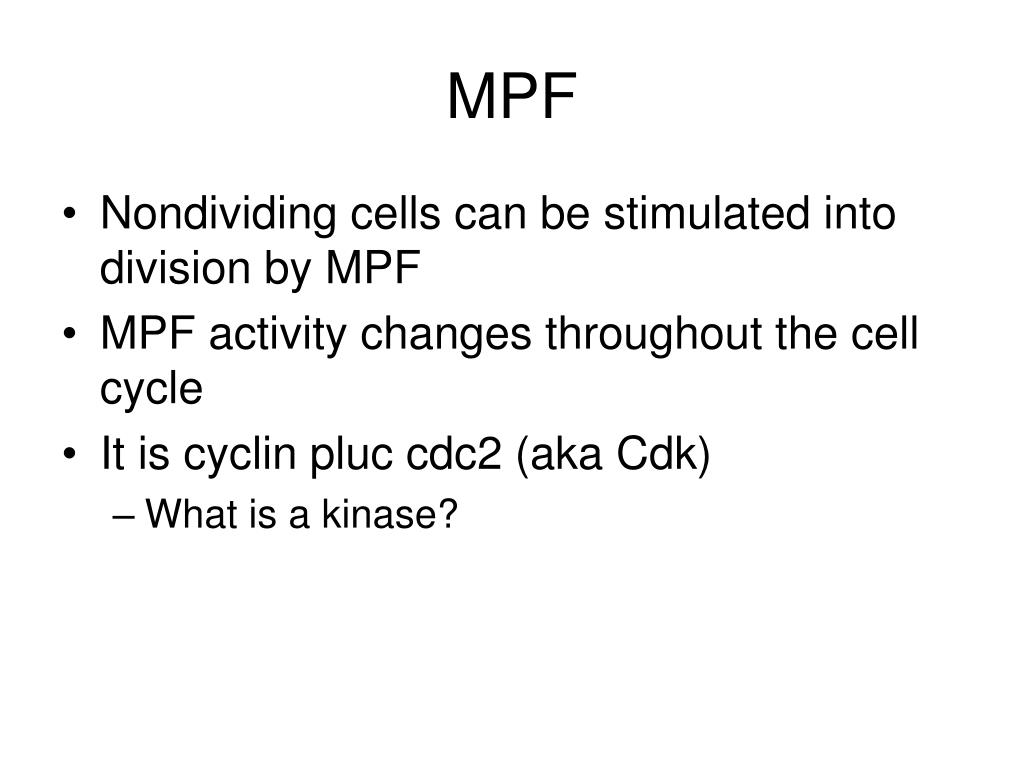 MPF • Nondividing cells can be stimulated into division by MPF • MPF activity changes throughout the cell cycle • It is cyclin pluc cdc2 (aka Cdk) • What is a kinase?