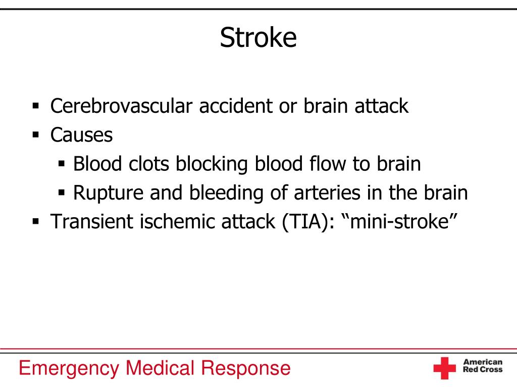 Stroke • Cerebrovascular accident or brain attack • Causes • Blood clots blocking blood flow to brain • Rupture and bleeding of arteries in the brain • Transient ischemic attack (TIA): “mini-stroke”
