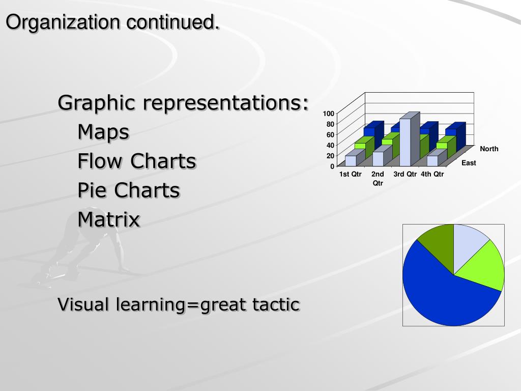 Organization continued. Graphic representations: Maps Flow Charts Pie Charts Matrix Visual learning=great tactic