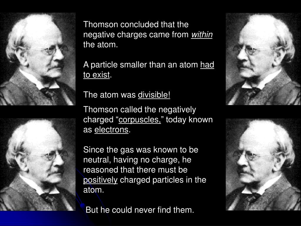Thomson concluded that the negative charges came from within the atom. A particle smaller than an atom had to exist. The atom was divisible! Thomson called the negatively charged “corpuscles,” today known as electrons. Since the gas was known to be neutral, having no charge, he reasoned that there must be positively charged particles in the atom. But he could never find them.