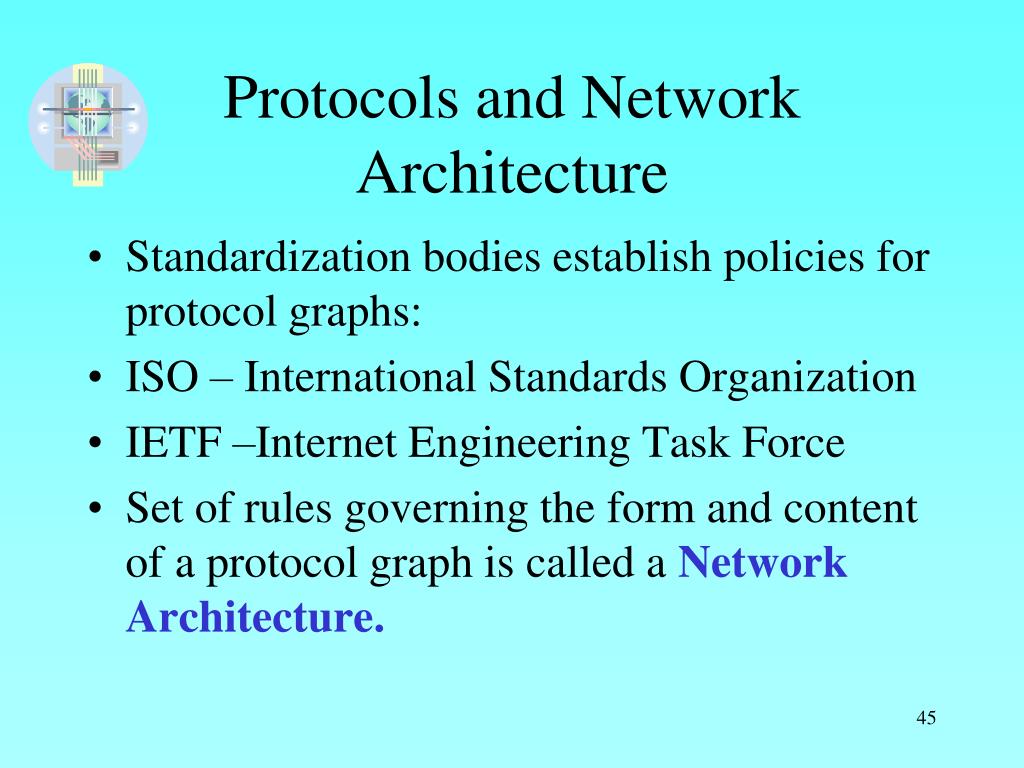 Protocols and Network Architecture • Standardization bodies establish policies for protocol graphs: • ISO – International Standards Organization • IETF –Internet Engineering Task Force • Set of rules governing the form and content of a protocol graph is called a Network Architecture.