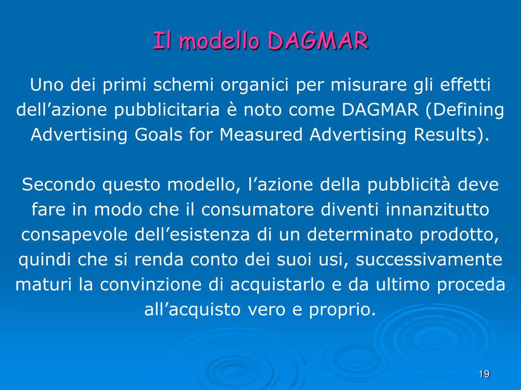 Il modello DAGMAR Uno dei primi schemi organici per misurare gli effetti dell’azione pubblicitaria è noto come DAGMAR (Defining Advertising Goals for Measured Advertising Results). Secondo questo modello, l’azione della pubblicità deve fare in modo che il consumatore diventi innanzitutto consapevole dell’esistenza di un determinato prodotto, quindi che si renda conto dei suoi usi, successivamente maturi la convinzione di acquistarlo e da ultimo proceda all’acquisto vero e proprio.