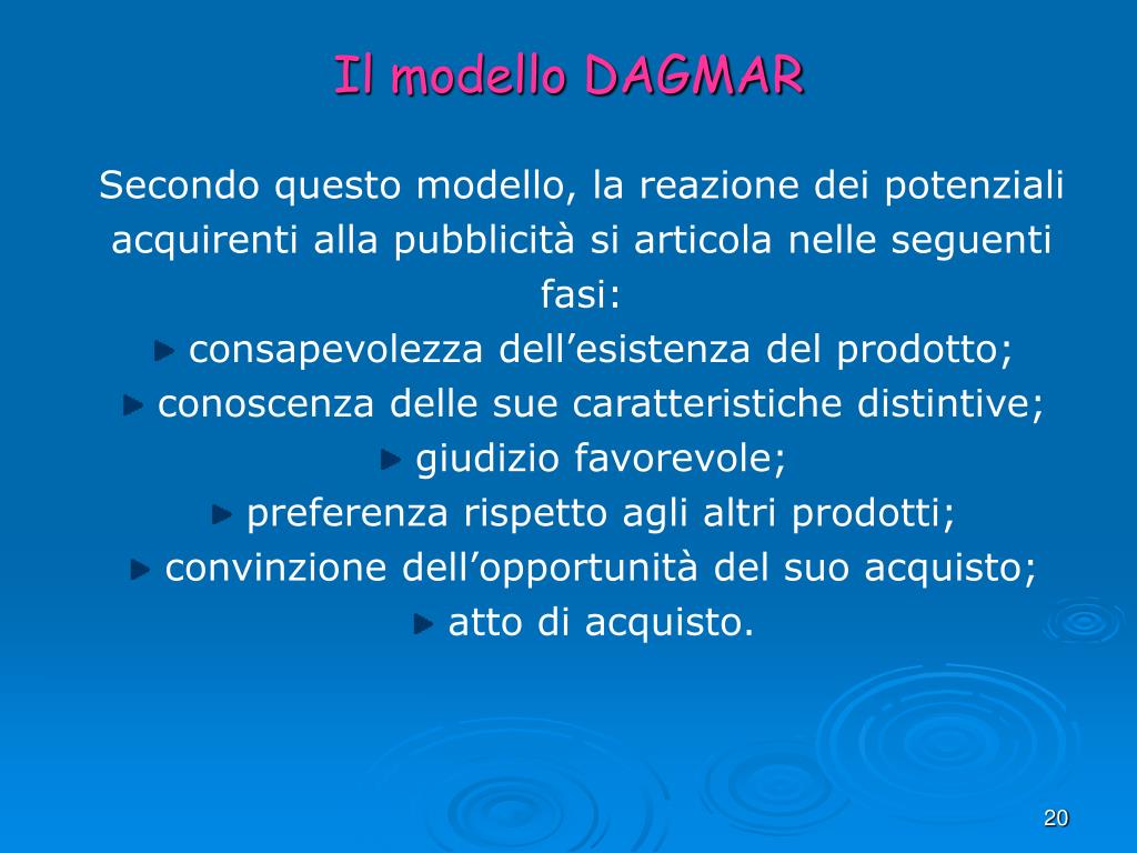 Il modello DAGMAR • Secondo questo modello, la reazione dei potenziali acquirenti alla pubblicità si articola nelle seguenti fasi: • consapevolezza dell’esistenza del prodotto; • conoscenza delle sue caratteristiche distintive; • giudizio favorevole; • preferenza rispetto agli altri prodotti; • convinzione dell’opportunità del suo acquisto; • atto di acquisto.