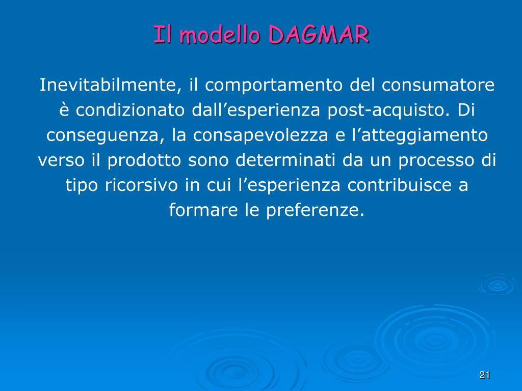Il modello DAGMAR • Si tratta chiaramente di un modello gerarchico. • Per i prodotti di largo consumo alcune fasi del processo non sono rispettate dei consumatori, in quanto il loro acquisto si basa soprattutto sull’abitudine e sulla ripetizione di comportamenti consolidati. • Il comportamento del consumatore è fortemente condizionato dall’esperienza post-acquisto e dal passaparola.