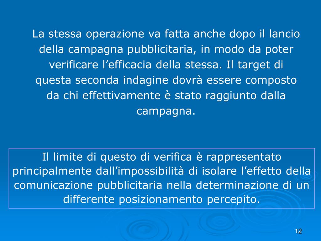 La stessa operazione va fatta anche dopo il lancio della campagna pubblicitaria, in modo da poter verificare l’efficacia della stessa. Il target di questa seconda indagine dovrà essere composto da chi effettivamente è stato raggiunto dalla campagna. Il limite di questo di verifica è rappresentato principalmente dall’impossibilità di isolare l’effetto della comunicazione pubblicitaria nella determinazione di un differente posizionamento percepito.