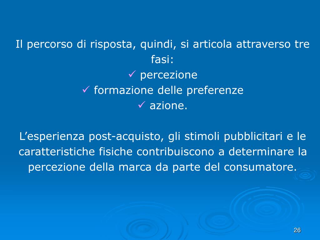 Il percorso di risposta, quindi, si articola attraverso tre fasi: • percezione • formazione delle preferenze • azione. L’esperienza post-acquisto, gli stimoli pubblicitari e le caratteristiche fisiche contribuiscono a determinare la percezione della marca da parte del consumatore.