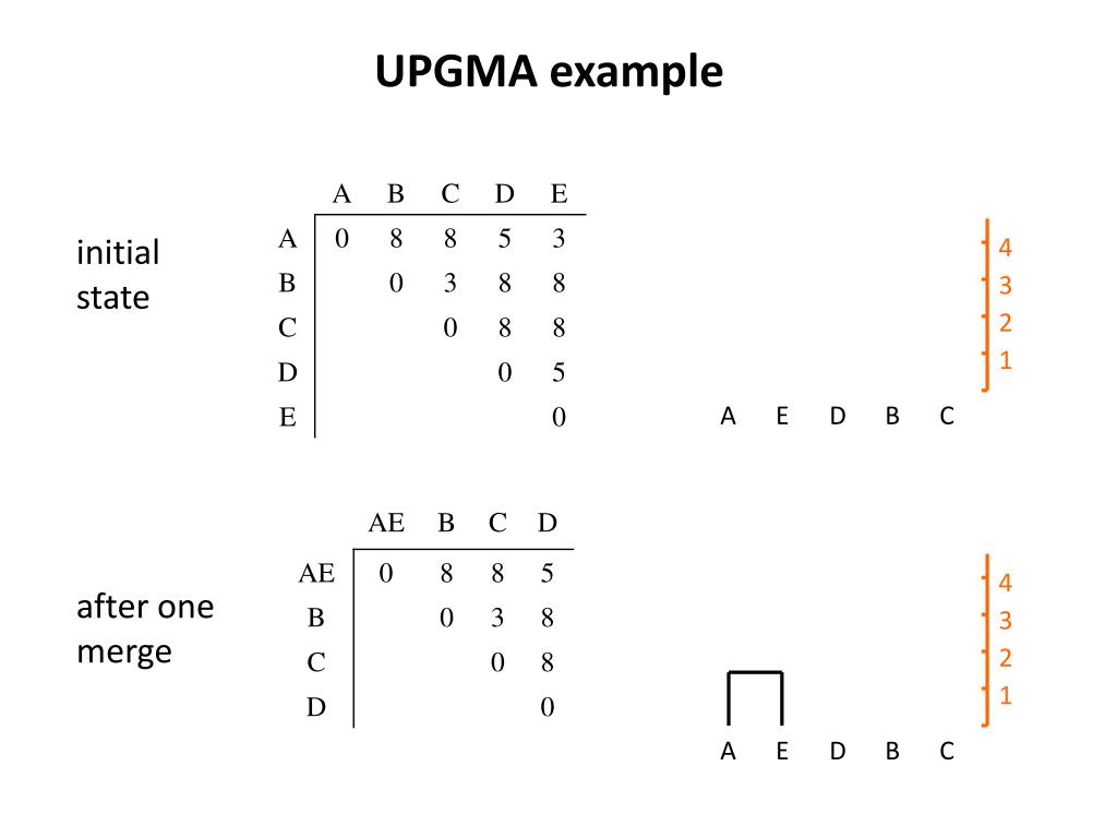 4 3 2 1 A E D B C 4 3 2 1 A E D B C UPGMA example initial state after one merge
