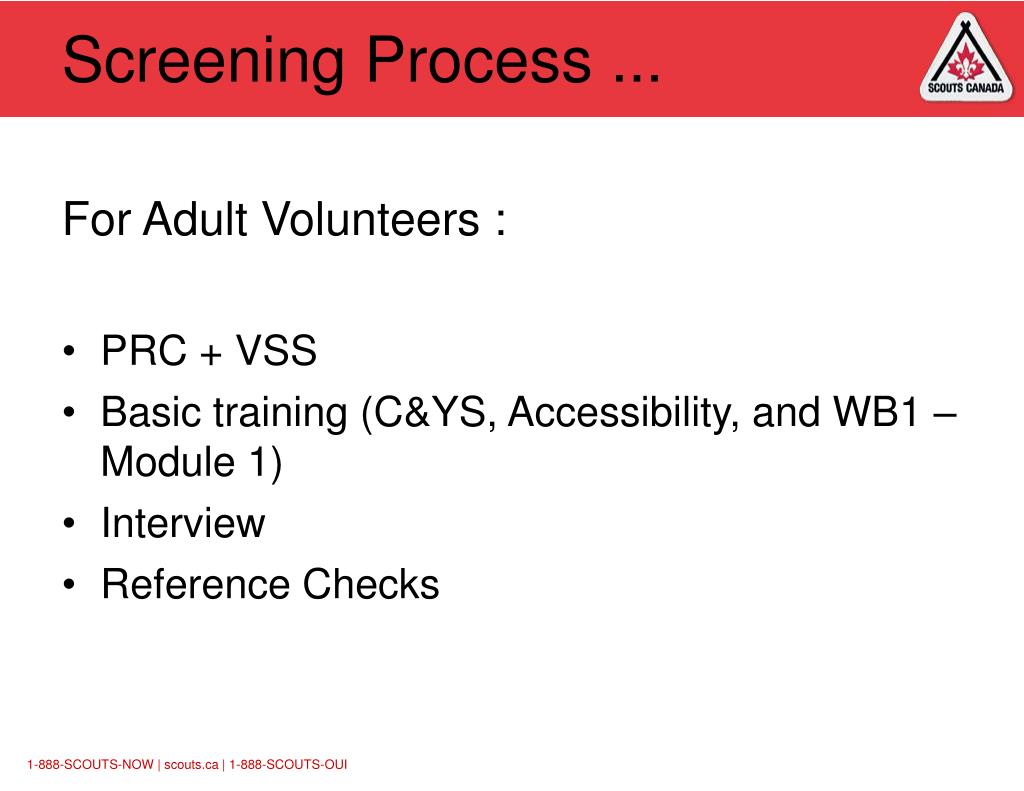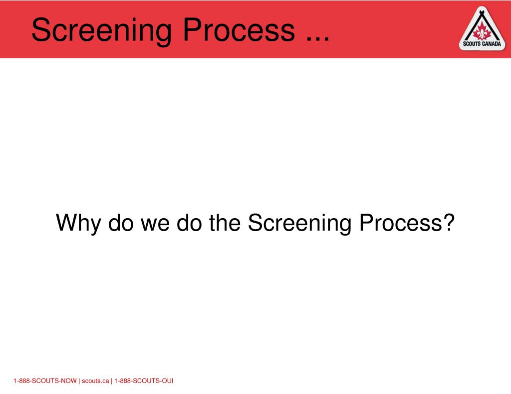 Screening Process ... Why are we doing the Screening Process? Keep Scouts Safe From Harm Ensure suitable people are working with youth Ensure volunteers are equipped with basic training BEFORE they work with the youth A key part of the risk management “mantra”: ' Being in the right place, at the right time, with the right people, and the right equipment … '