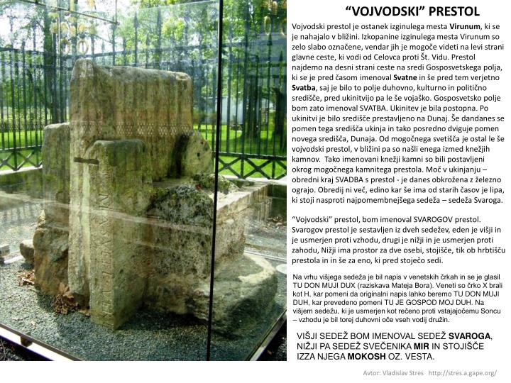 1. “VOJVODSKI” PRESTOL Vojvodski prestol je ostanek izginulega mesta Virunum, ki se je nahajalo v bližini. Izkopanine izginulega mesta Virunum so zelo slabo označene, vendar jih je mogoče videti na levi strani glavne ceste, ki vodi od Celovca proti Št. Vidu. Prestol najdemo na desni strani ceste na sredi Gosposvetskega polja, ki se je pred časom imenoval Svatne in še pred tem verjetno Svatba, saj je bilo to polje duhovno, kulturno in politično središče, pred ukinitvijo pa le še vojaško. Gosposvetsko polje bom zato imenoval SVATBA. Ukinitev je bila postopna. Po ukinitvi je bilo središče prestavljeno na Dunaj. Še dandanes se pomen tega središča ukinja in tako posredno dviguje pomen novega središča, Dunaja. Od mogočnega svetišča je ostal le še vojvodski prestol, v bližini pa so našli enega izmed knežjih kamnov. Tako imenovani knežji kamni so bili postavljeni okrog mogočnega kamnitega prestola. Moč v ukinjanju – obredni kraj SVADBA s prestol - je danes obkrožena z železno ograjo. Obredij ni več, edino kar še ima od starih časov je lipa, ki stoji nasproti najpomembnejšega sedeža – sedeža Svaroga. “Vojvodski” prestol, bom imenoval SVAROGOV prestol. Svarogov prestol je sestavljen iz dveh sedežev, eden je višji in je usmerjen proti vzhodu, drugi je nižji in je usmerjen proti zahodu, Nižji ima prostor za dve osebi, stojišče, tik ob hrbtišču prestola in in še za eno, ki pred stoječo sedi. Na vrhu višjega sedeža je bil napis v venetskih črkah in se je glasil TU DON MUJI DUX (raziskava Mateja Bora). Veneti so črko X brali kot H, kar pomeni da originalni napis lahko beremo TU DON MUJI DUH, kar prevedeno pomeni TU JE GOSPOD MOJ DUH. Na višjem sedežu, ki je usmerjen kot rečeno proti vstajajočemu Soncu – vzhodu je bil torej duhovni oče vseh vodij družin. VIŠJI SEDEŽ BOM IMENOVAL SEDEŽ SVAROGA, NIŽJI PA SEDEŽ SVEČENIKA MIR IN STOJIŠČE IZZA NJEGA MOKOSH OZ. VESTA. Avtor: Vladislav Stres http://stres.a.gape.org/