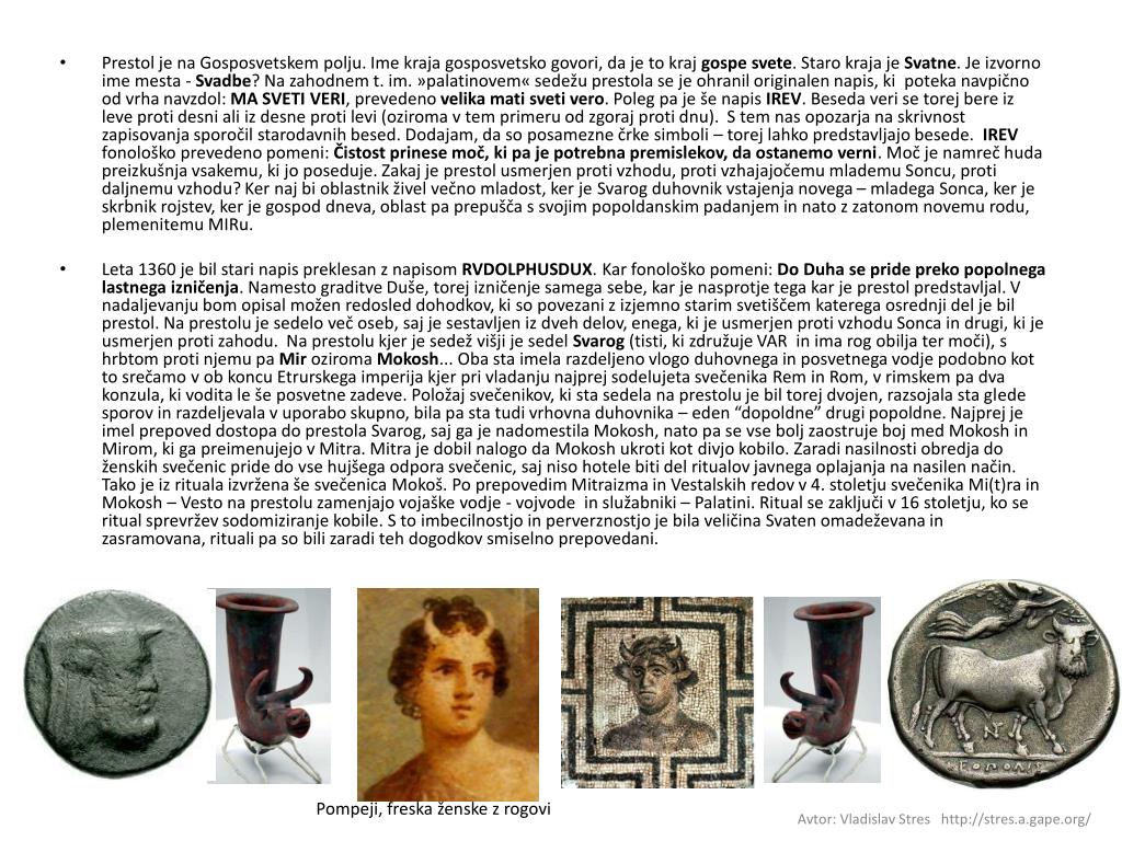 2. Prestol je na Gosposvetskem polju. Ime kraja gosposvetsko govori, da je to kraj gospe svete. Staro kraja je Svatne. Je izvorno ime mesta - Svadbe? Na zahodnem t. im. »palatinovem« sedežu prestola se je ohranil originalen napis, ki poteka navpično od vrha navzdol: MA SVETI VERI, prevedeno velika mati sveti vero. Poleg pa je še napis IREV. Beseda veri se torej bere iz leve proti desni ali iz desne proti levi (oziroma v tem primeru od zgoraj proti dnu). S tem nas opozarja na skrivnost zapisovanja sporočil starodavnih besed. Dodajam, da so posamezne črke simboli – torej lahko predstavljajo besede. IREV fonološko prevedeno pomeni: Čistost prinese moč, ki pa je potrebna premislekov, da ostanemo verni. Moč je namreč huda preizkušnja vsakemu, ki jo poseduje. Zakaj je prestol usmerjen proti vzhodu, proti vzhajajočemu mlademu Soncu, proti daljnemu vzhodu? Ker naj bi oblastnik živel večno mladost, ker je Svarog duhovnik vstajenja novega – mladega Sonca, ker je skrbnik rojstev, ker je gospod dneva, oblast pa prepušča s svojim popoldanskim padanjem in nato z zatonom novemu rodu, plemenitemu MIRu. • Leta 1360 je bil stari napis preklesan z napisom RVDOLPHUSDUX. Kar fonološko pomeni: Do Duha se pride preko popolnega lastnega izničenja. Namesto graditve Duše, torej izničenje samega sebe, kar je nasprotje tega kar je prestol predstavljal. V nadaljevanju bom opisal možen redosled dohodkov, ki so povezani z izjemno starim svetiščem katerega osrednji del je bil prestol. Na prestolu je sedelo več oseb, saj je sestavljen iz dveh delov, enega, ki je usmerjen proti vzhodu Sonca in drugi, ki je usmerjen proti zahodu. Na prestolu kjer je sedež višji je sedel Svarog(tisti, ki združuje VAR in ima rog obilja ter moči), s hrbtom proti njemu pa Mir oziromaMokosh... Oba sta imela razdeljeno vlogo duhovnega in posvetnega vodje podobno kot to srečamo v ob koncu Etrurskega imperija kjer pri vladanju najprej sodelujeta svečenika Rem in Rom, v rimskem pa dva konzula, ki vodita le še posvetne zadeve. Položaj svečenikov, ki sta sedela na prestolu je bil torej dvojen, razsojala sta glede sporov in razdeljevala v uporabo skupno, bila pa sta tudi vrhovna duhovnika – eden “dopoldne” drugi popoldne. Najprej je imel prepoved dostopa do prestola Svarog, saj ga je nadomestila Mokosh, nato pa se vse bolj zaostruje boj med Mokosh in Mirom, ki ga preimenujejo v Mitra. Mitra je dobil nalogo da Mokosh ukroti kot divjo kobilo. Zaradi nasilnosti obredja do ženskih svečenic pride do vse hujšega odpora svečenic, saj niso hotele biti del ritualov javnega oplajanja na nasilen način. Tako je iz rituala izvržena še svečenica Mokoš. Po prepovedim Mitraizma in Vestalskih redov v 4. stoletju svečenika Mi(t)ra in Mokosh – Vesto na prestolu zamenjajo vojaške vodje - vojvode in služabniki – Palatini. Ritual se zaključi v 16 stoletju, ko se ritual sprevrževsodomiziranje kobile. S to imbecilnostjo in perverznostjo je bila veličina Svaten omadeževana in zasramovana, rituali pa so bili zaradi teh dogodkov smiselno prepovedani. Avtor: Vladislav Stres http://stres.a.gape.org/ Pompeji, freska ženske z rogovi
