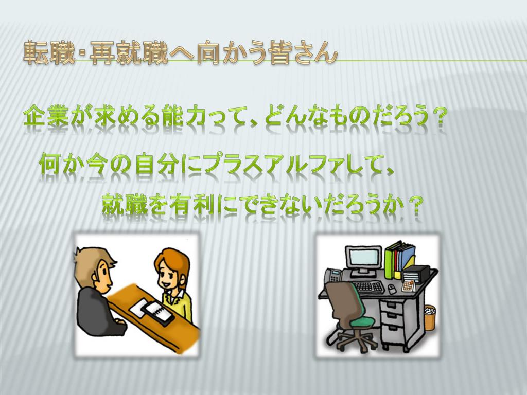 企業が求める能力って、どんなものだろう? 何か今の自分にプラスアルファして、 就職を有利にできないだろうか? 転職・再就職へ向かう皆さん