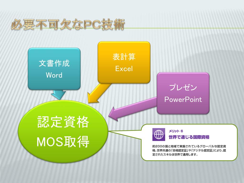 必要不可欠なPC技術 • 表計算 • Excel • 文書作成 • Word • プレゼン • PowerPoint • 認定資格 • MOS取得