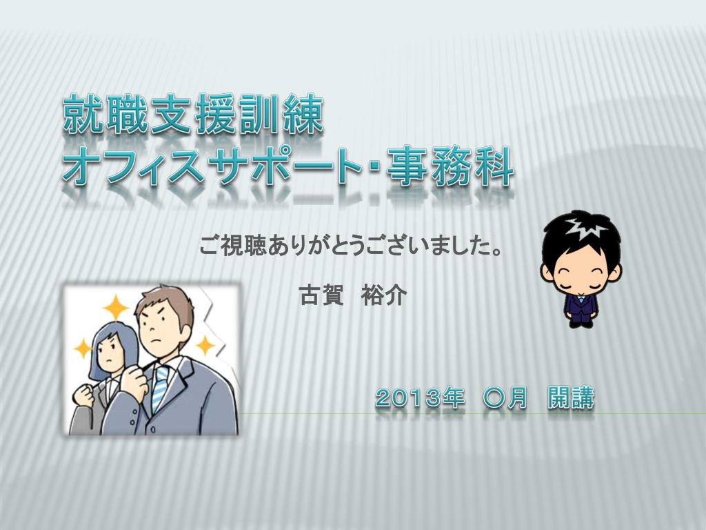 2013年 ○月 開講 ご視聴ありがとうございました。 古賀 裕介 就職支援訓練オフィスサポート・事務科