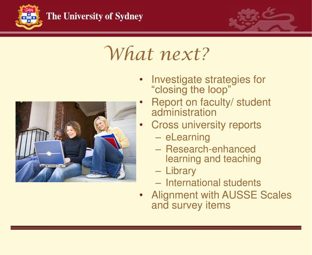 What next? • Investigate strategies for “closing the loop” • Report on faculty/ student administration • Cross university reports • eLearning • Research-enhanced learning and teaching • Library • International students • Alignment with AUSSE Scales and survey items
