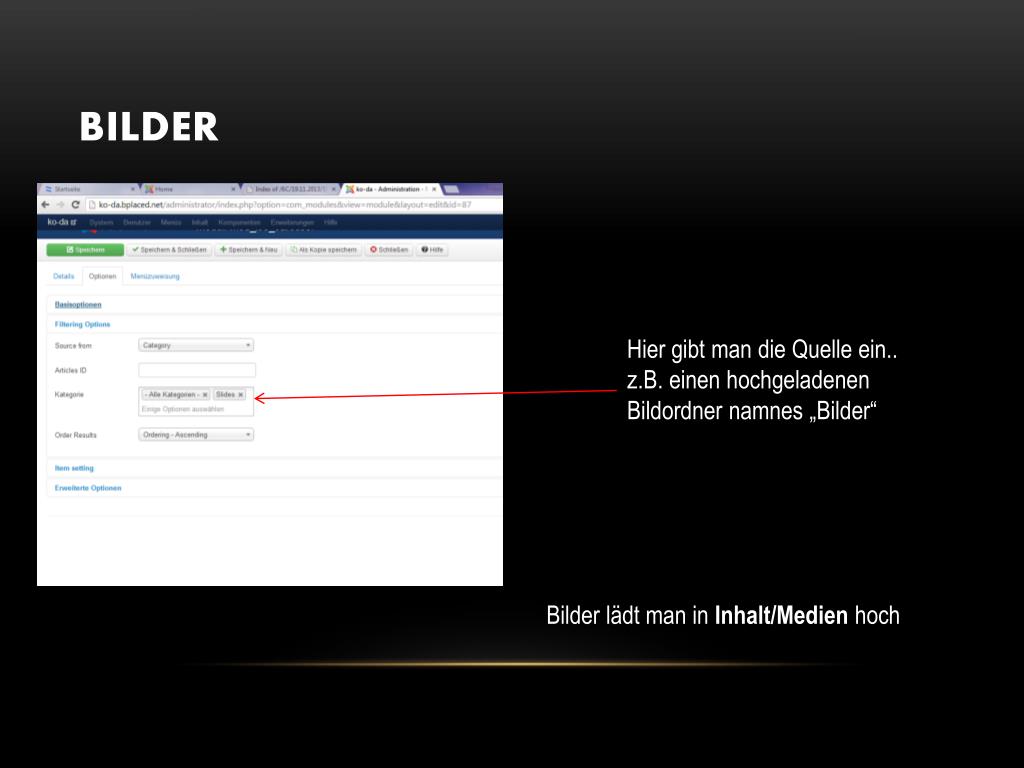 Bilder Hier gibt man die Quelle ein..z.B. einen hochgeladenen Bildordner namnes „Bilder“ Bilder lädt man in Inhalt/Medien hoch