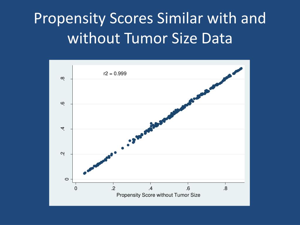 Generation of Propensity Scores • Serial logistic regression models • Variables predictive of choice of local control • Age • Tumor site • Year of diagnosis
