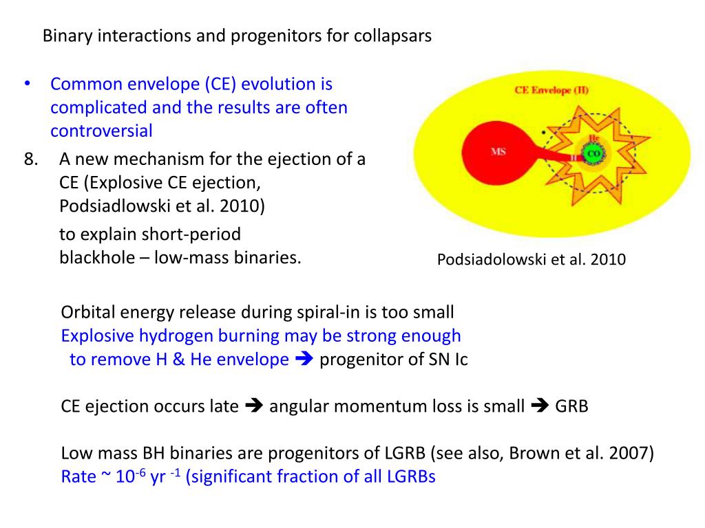 Binary interactions and progenitors for collapsars • Common envelope (CE) evolution is complicated and the results are often controversial • A new mechanism for the ejection of a CE (Explosive CE ejection, Podsiadlowski et al. 2010) to explain short-period blackhole – low-mass binaries. Podsiadolowski et al. 2010 Orbital energy release during spiral-in is too small Explosive hydrogen burning may be strong enough to remove H & He envelope progenitor of SN Ic CE ejection occurs late angular momentum loss is small GRB Low mass BH binaries are progenitors of LGRB (see also, Brown et al. 2007) Rate ~ 10-6 yr -1 (significant fraction of all LGRBs