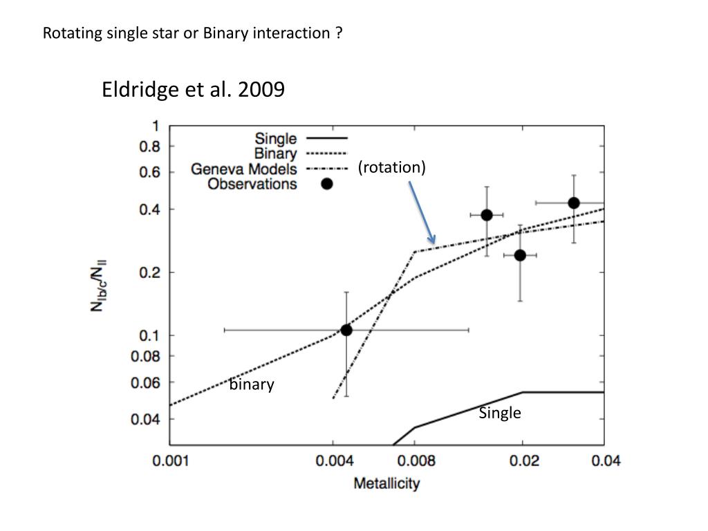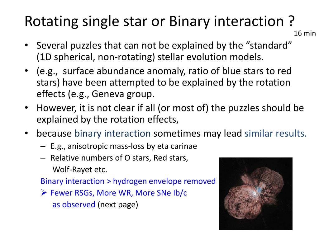 Rotating single star or Binary interaction ? 16 min • Several puzzles that can not be explained by the “standard” (1D spherical, non-rotating) stellar evolution models. • (e.g., surface abundance anomaly, ratio of blue stars to red stars) have been attempted to be explained by the rotation effects (e.g., Geneva group. • However, it is not clear if all (or most of) the puzzles should be explained by the rotation effects, • because binary interaction sometimes may lead similar results. • E.g., anisotropic mass-loss by eta carinae • Relative numbers of O stars, Red stars, Wolf-Rayet etc. Binary interaction > hydrogen envelope removed • Fewer RSGs, More WR, More SNeIb/c as observed (next page)