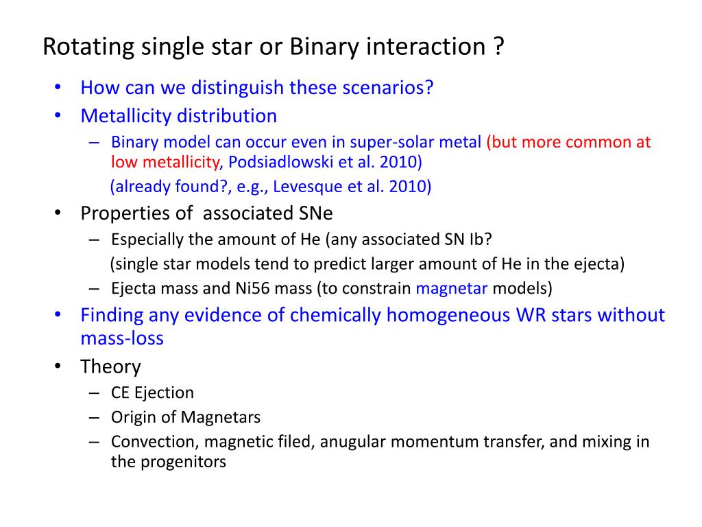 Rotating single star or Binary interaction ? • How can we distinguish these scenarios? • Metallicity distribution • Binary model can occur even in super-solar metal (but more common at low metallicity, Podsiadlowski et al. 2010) (already found?, e.g., Levesque et al. 2010) • Properties of associated SNe • Especially the amount of He (any associated SN Ib? (single star models tend to predict larger amount of He in the ejecta) • Ejecta mass and Ni56 mass (to constrain magnetarmodels) • Finding any evidence of chemically homogeneous WR stars without mass-loss • Theory • CE Ejection • Origin of Magnetars • Convection, magnetic filed, anugular momentum transfer, and mixing in the progenitors