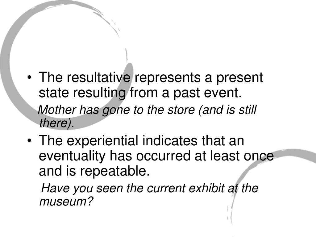 The resultative represents a present state resulting from a past event. Mother has gone to the store (and is still there). • The experiential indicates that an eventuality has occurred at least once and is repeatable. Have you seen the current exhibit at the museum?