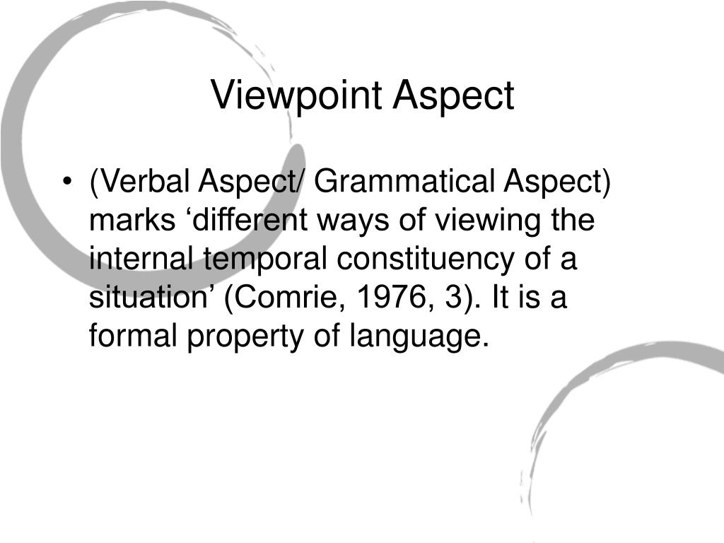 Viewpoint Aspect • (Verbal Aspect/ Grammatical Aspect) marks ‘different ways of viewing the internal temporal constituency of a situation’ (Comrie, 1976, 3). It is a formal property of language.