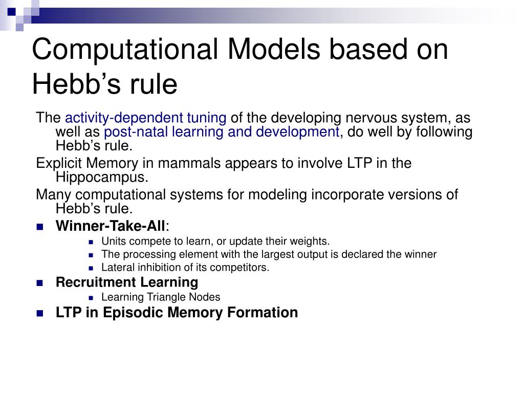 Computational Models based onHebb’s rule The activity-dependent tuning of the developing nervous system, as well as post-natal learning and development, do well by following Hebb’s rule. Explicit Memory in mammals appears to involve LTP in the Hippocampus. Many computational systems for modeling incorporate versions of Hebb’s rule. • Winner-Take-All: • Units compete to learn, or update their weights. • The processing element with the largest output is declared the winner • Lateral inhibition of its competitors. • Recruitment Learning • Learning Triangle Nodes • LTP in Episodic Memory Formation