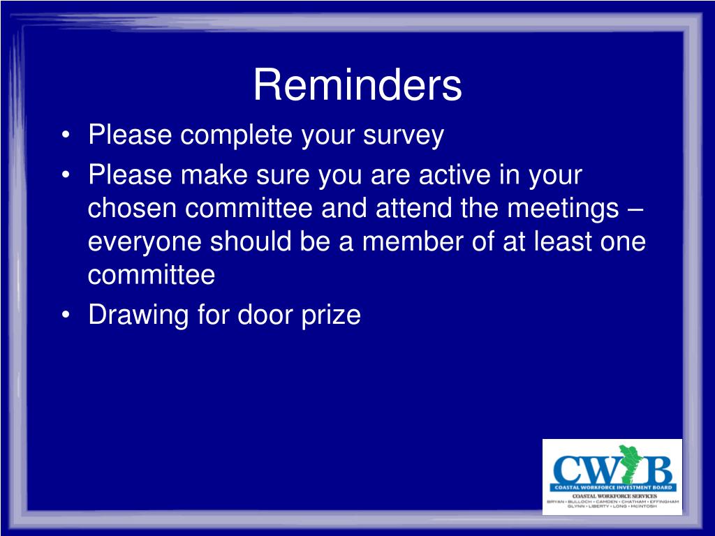 Reminders • Please complete your survey • Please make sure you are active in your chosen committee and attend the meetings – everyone should be a member of at least one committee • Drawing for door prize