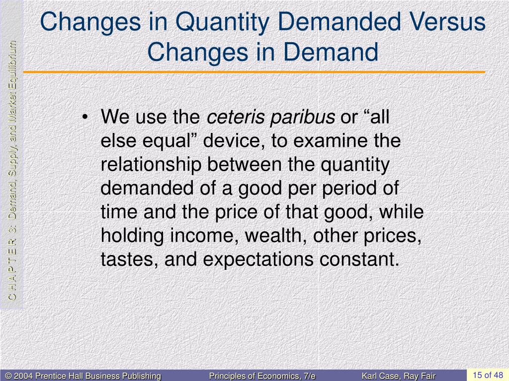 Changes in Quantity Demanded Versus Changes in Demand • We use the ceteris paribus or “all else equal” device, to examine the relationship between the quantity demanded of a good per period of time and the price of that good, while holding income, wealth, other prices, tastes, and expectations constant.