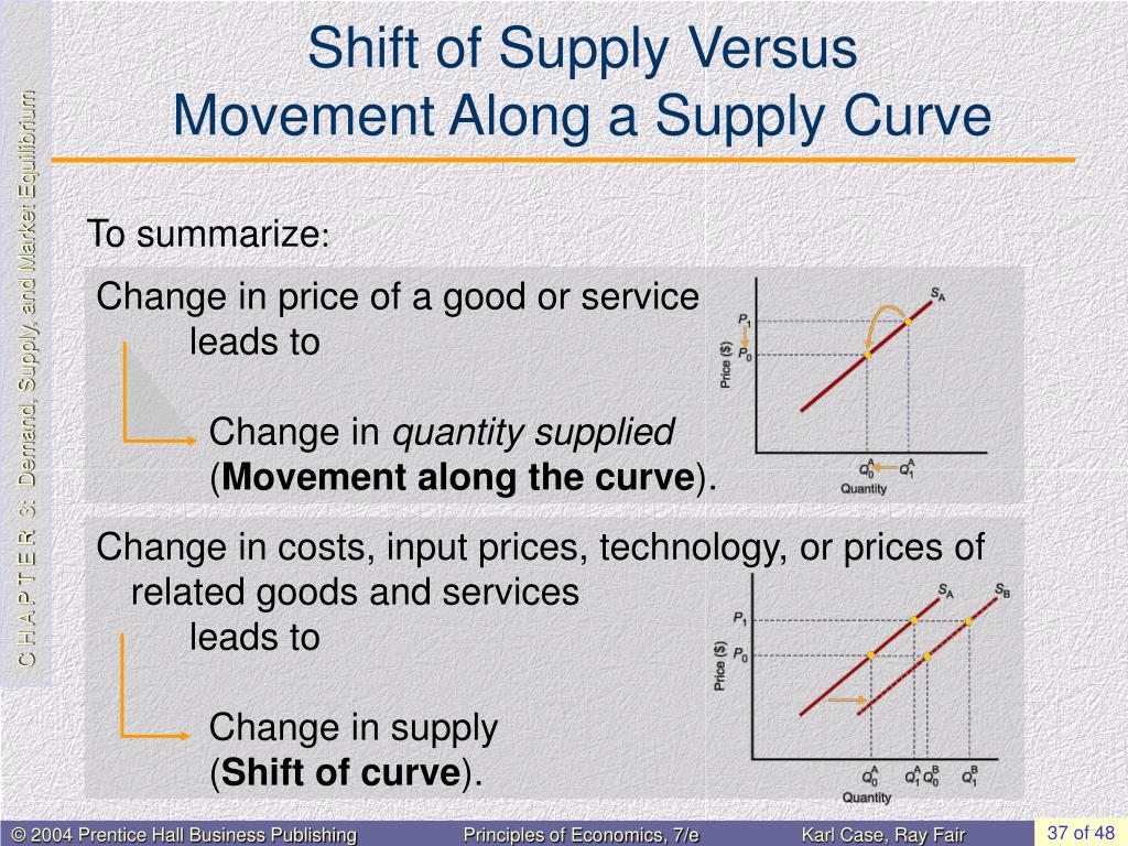 Shift of Supply VersusMovement Along a Supply Curve Change in price of a good or service leads to Change in quantity supplied(Movement along the curve). Change in costs, input prices, technology, or prices of related goods and services leads to Change in supply (Shift of curve). To summarize: