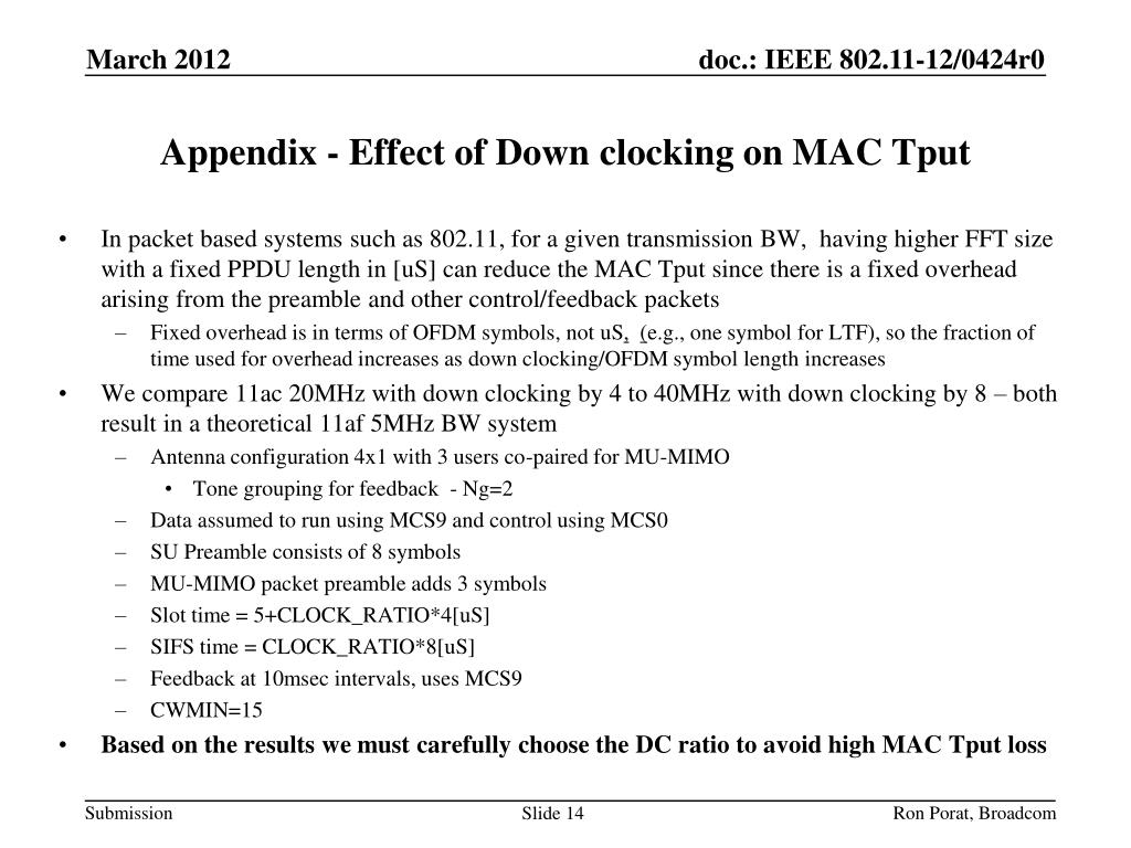 5MHz channel bandwidth can be achieved by • Option A: Downclocking VHT20 by a factor of 4 • Option B: Downclocking VHT40 by a factor of 8 Cont. – Summary Table