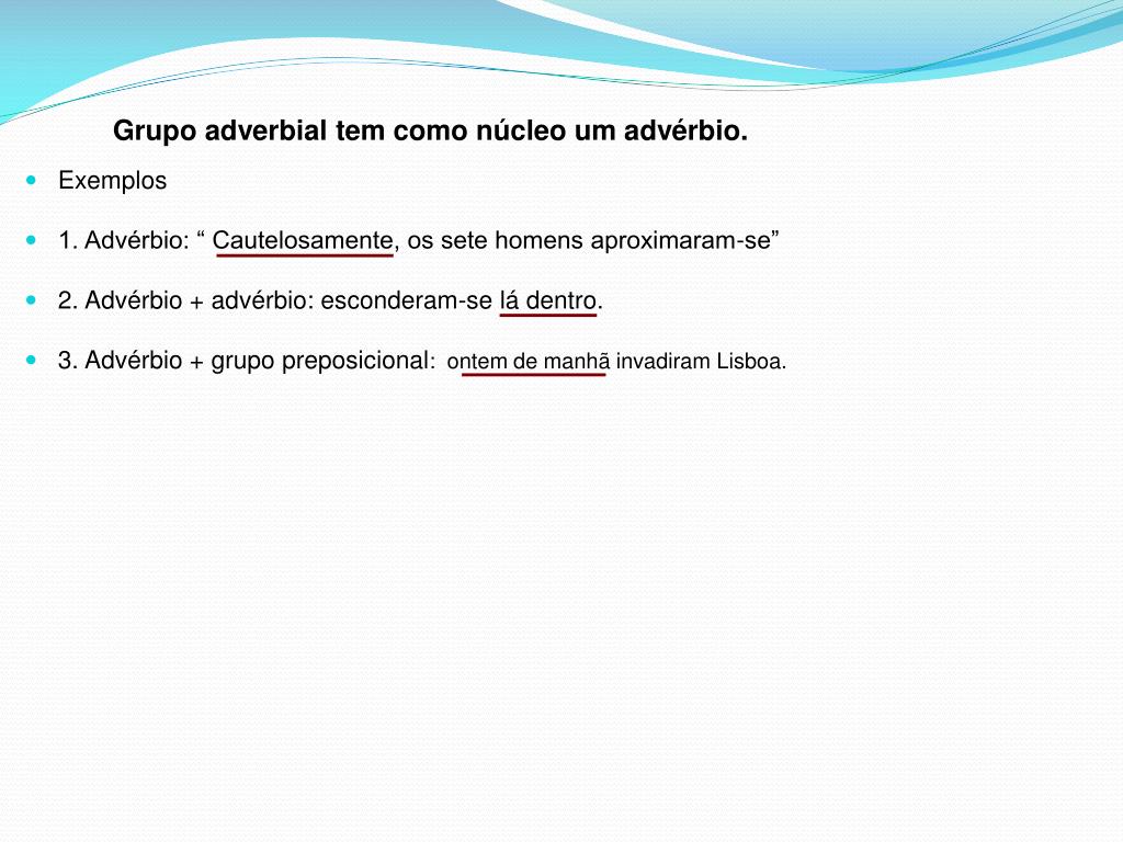Grupo adverbial tem como núcleo um advérbio. • Exemplos • 1. Advérbio: “ Cautelosamente, os sete homens aproximaram-se” • 2. Advérbio + advérbio: esconderam-se lá dentro. • 3. Advérbio + grupo preposicional: ontem de manhã invadiram Lisboa.