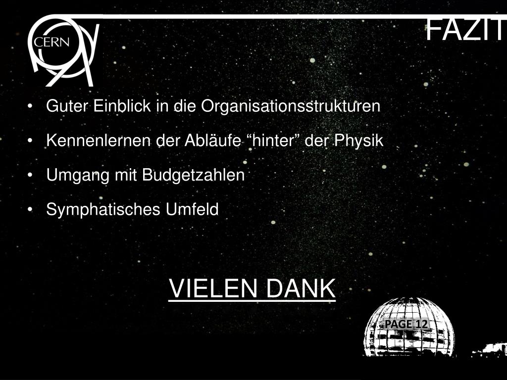 FAZIT • GuterEinblick in die Organisationsstrukturen • Kennenlernen der Abläufe “hinter” der Physik • UmgangmitBudgetzahlen • SymphatischesUmfeld VIELEN DANK