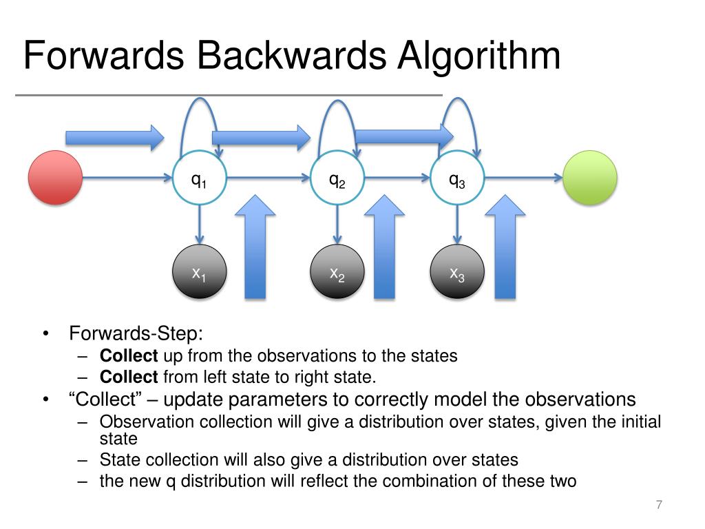 Forwards Backwards Algorithm • Forwards-Step: • Collect up from the observations to the states • Collect from left state to right state. • “Collect” – update parameters to correctly model the observations • Observation collection will give a distribution over states, given the initial state • State collection will also give a distribution over states • the new q distribution will reflect the combination of these two q1 q2 q3 x1 x2 x3