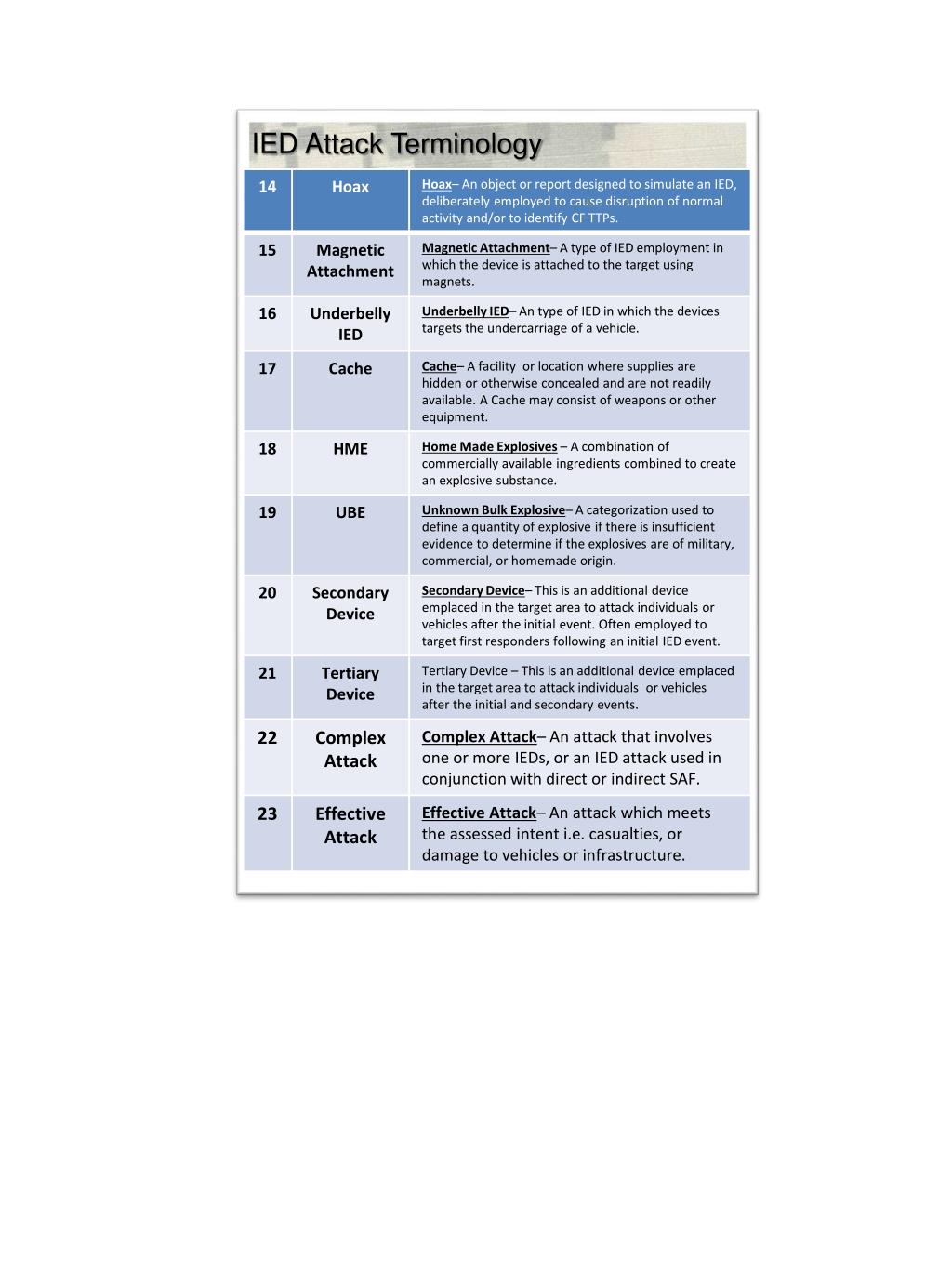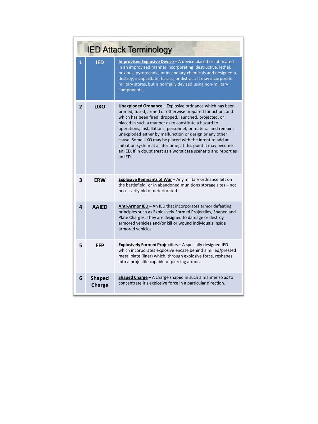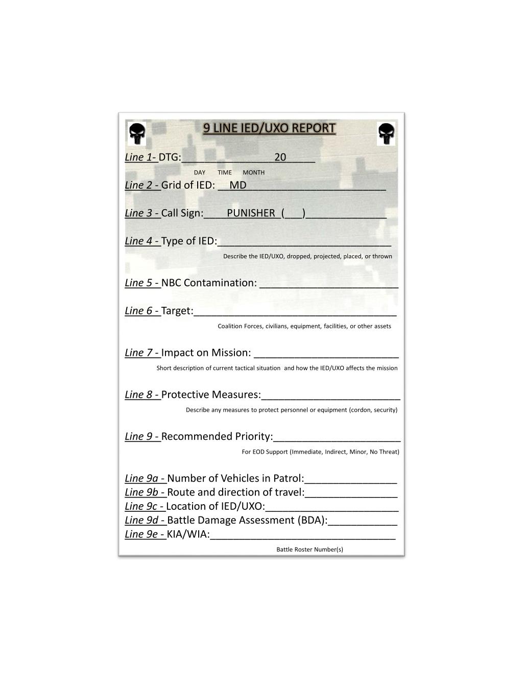 9 LINE IED/UXO REPORT Line 1- DTG:________________20_____ DAY TIME MONTH Line 2 - Grid of IED: __MD________________________ Line 3 - Call Sign:____PUNISHER_(___)______________ Line 4 - Type of IED:______________________________ Describe the IED/UXO, dropped, projected, placed, or thrown Line 5 - NBC Contamination: ________________________ Line 6 - Target:___________________________________ Coalition Forces, civilians, equipment, facilities, or other assets Line 7 - Impact on Mission: _________________________ Short description of current tactical situation and how the IED/UXO affects the mission Line 8 - Protective Measures:________________________ Describe any measures to protect personnel or equipment (cordon, security) Line 9 - Recommended Priority:______________________ For EOD Support (Immediate, Indirect, Minor, No Threat) Line 9a - Number of Vehicles in Patrol:________________ Line 9b - Route and direction of travel:________________ Line 9c - Location of IED/UXO:_______________________ Line 9d - Battle Damage Assessment (BDA):____________ Line 9e - KIA/WIA:________________________________ Battle Roster Number(s)