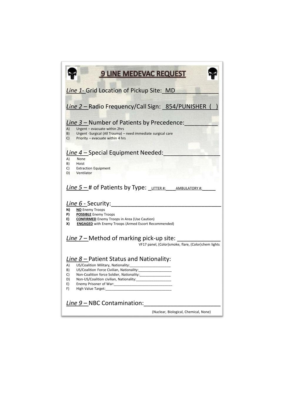 9 LINE MEDEVAC REQUEST Line 1- Grid Location of Pickup Site:_MD_____________ Line 2 – Radio Frequency/Call Sign: _854/PUNISHER ( ) Line 3 – Number of Patients by Precedence:__________ Urgent – evacuate within 2hrs Urgent -Surgical (All Trauma) – need immediate surgical care Priority – evacuate within 4 hrs Line 4 – Special Equipment Needed:_________________ A) None Hoist Extraction Equipment Ventilator Line 5 – # of Patients by Type: _LITTER #:___AMBULATORY #:____ Line 6 - Security:_________________________________ NO Enemy Troops POSSIBLE Enemy Troops CONFIRMED Enemy Troops in Area (Use Caution) X) ENGAGEDwith Enemy Troops (Armed Escort Recommended) Line 7 – Method of marking pick-up site: _____________ VF17 panel, (Color)smoke, flare, (Color)chem lights Line 8 – Patient Status and Nationality: US/Coalition Military, Nationality:_____________________ US/Coalition Force Civilian, Nationality:_________________ Non-Coalition force Soldier, Nationality:________________ Non-US/Coalition civilian, Nationality:__________________ Enemy Prisoner of War:______________________________ High Value Target:__________________________________ Line 9 – NBC Contamination:_______________________ (Nuclear, Biological, Chemical, None)