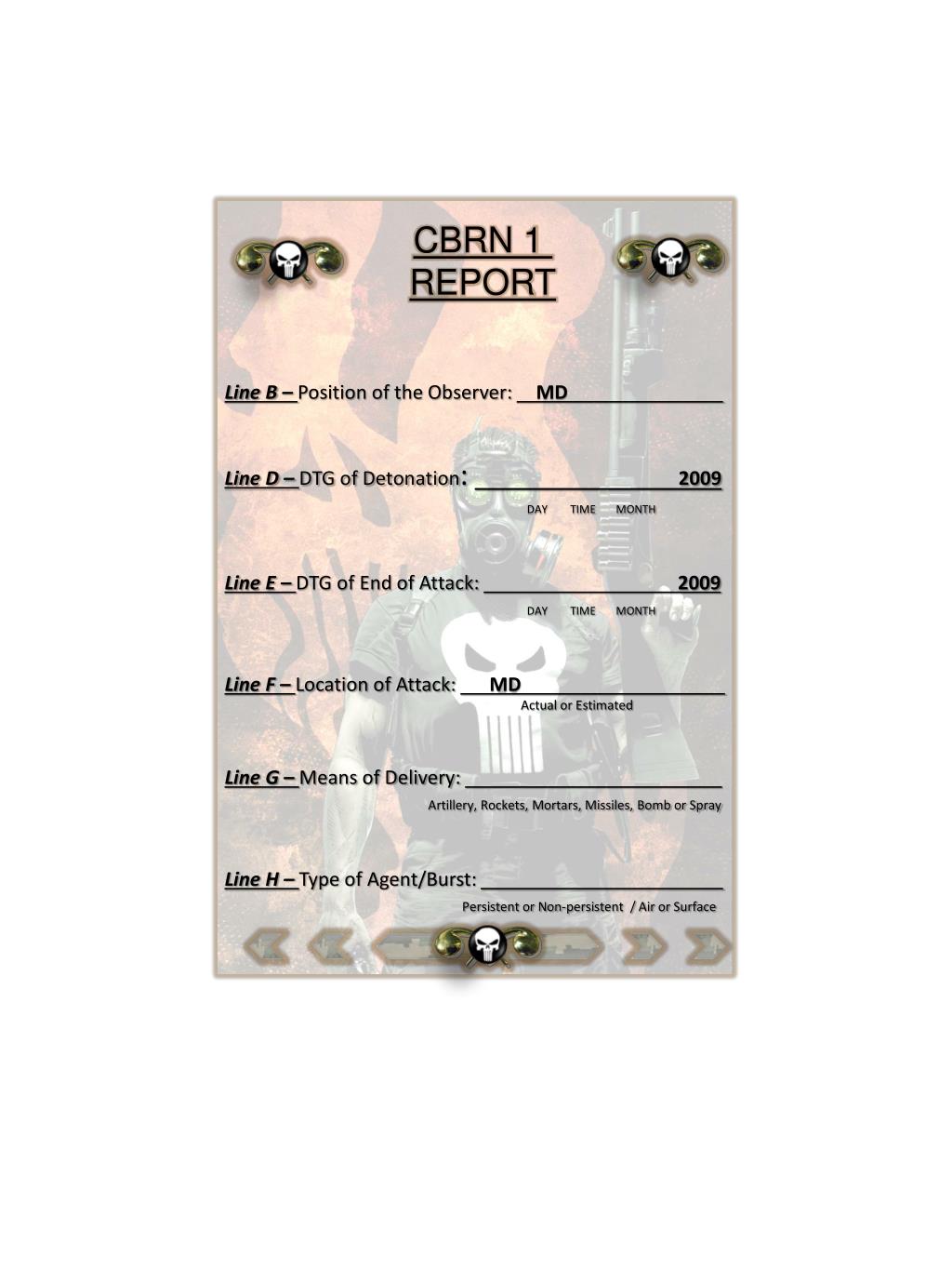 CBRN 1 REPORT Line B – Position of the Observer: MD Line D – DTG of Detonation: 2009 DAY TIME MONTH Line E – DTG of End of Attack: 2009 DAY TIME MONTH Line F – Location of Attack: MD Actual or Estimated Line G – Means of Delivery: Artillery, Rockets, Mortars, Missiles, Bomb or Spray Line H – Type of Agent/Burst: Persistent or Non-persistent / Air or Surface