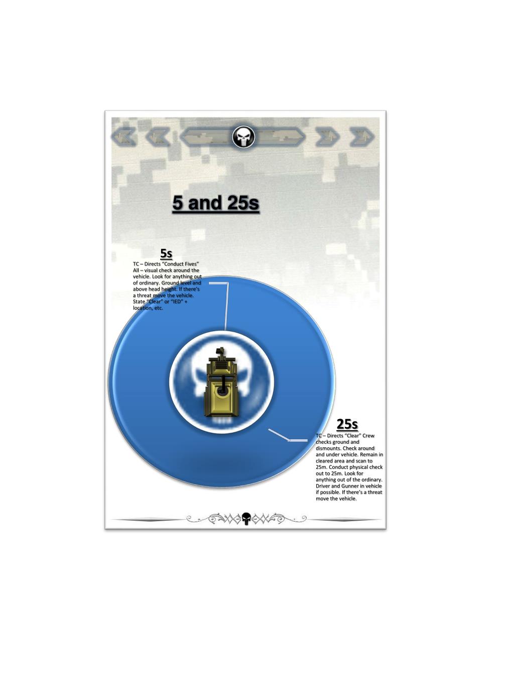 Vehicle’s PCC/PCIs • Current Dispatch (signed by driver/commander) • PMCS complete and annotated (before and during) • Vehicle topped off • Fuel can strapped • Rhino dropped • Load Plan (everything secured and tied down) • Four MRE boxes (one opened) • Four packs of water • Cooler with ice and one pack of water • CLS bag • WALK Kit • Smoke grenade • Red/Green Flag • 12in Crescent Wrench • Radio checks and operational on all systems: • Radio (Internal, Battalion) • BFT (FIPR to Battalion) • MBTR (Internal) • DAGR • DUKES (Jamming) • Rhino • *DUKES Mapper • Crew served weapons (cleaned, basic load, functions • check, properly mounted • Turret charged and freely rotates • UBL of ammo strapped down and secured • CLP • Binos (cleaned and stored near the TC) • Tow bar tighten down properly • Fire extinguishers fully charged • Windows and lights cleaned • Side view mirrors adjusted • Combat locks operational • Seatbelts operational • Paper Maps