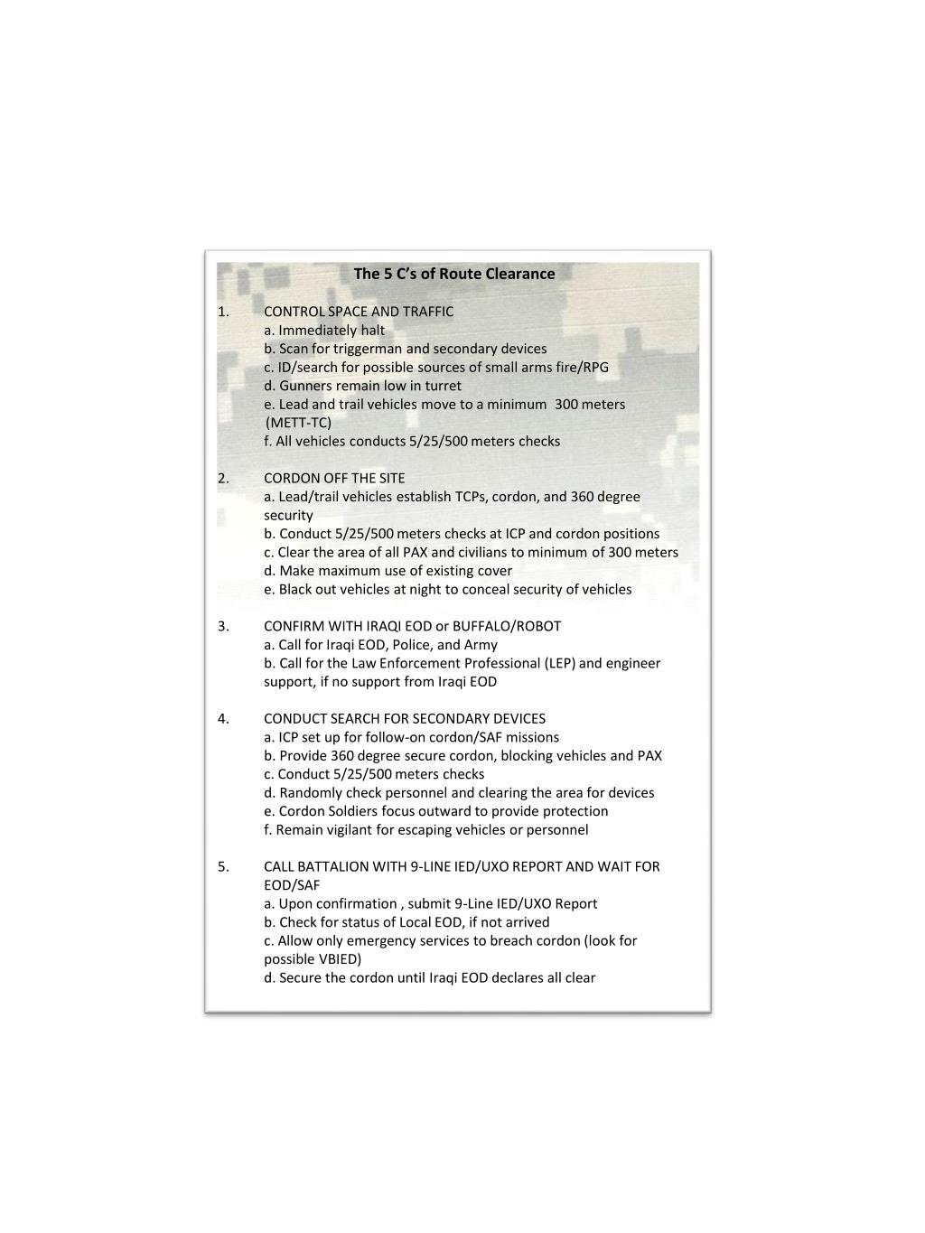 The 5 C’s of Route Clearance CONTROL SPACE AND TRAFFIC a. Immediately halt b. Scan for triggerman and secondary devices c. ID/search for possible sources of small arms fire/RPG d. Gunners remain low in turret e. Lead and trail vehicles move to a minimum 300 meters (METT-TC) f. All vehicles conducts 5/25/500 meters checks CORDON OFF THE SITE a. Lead/trail vehicles establish TCPs, cordon, and 360 degree security b. Conduct 5/25/500 meters checks at ICP and cordon positions c. Clear the area of all PAX and civilians to minimum of 300 meters d. Make maximum use of existing cover e. Black out vehicles at night to conceal security of vehicles CONFIRM WITH IRAQI EOD or BUFFALO/ROBOT a. Call for Iraqi EOD, Police, and Army b. Call for the Law Enforcement Professional (LEP) and engineer support, if no support from Iraqi EOD CONDUCT SEARCH FOR SECONDARY DEVICES a. ICP set up for follow-on cordon/SAF missions b. Provide 360 degree secure cordon, blocking vehicles and PAX c. Conduct 5/25/500 meters checks d. Randomly check personnel and clearing the area for devices e. Cordon Soldiers focus outward to provide protection f. Remain vigilant for escaping vehicles or personnel CALL BATTALION WITH 9-LINE IED/UXO REPORT AND WAIT FOR EOD/SAF a. Upon confirmation , submit 9-Line IED/UXO Report b. Check for status of Local EOD, if not arrived c. Allow only emergency services to breach cordon (look for possible VBIED) d. Secure the cordon until Iraqi EOD declares all clear