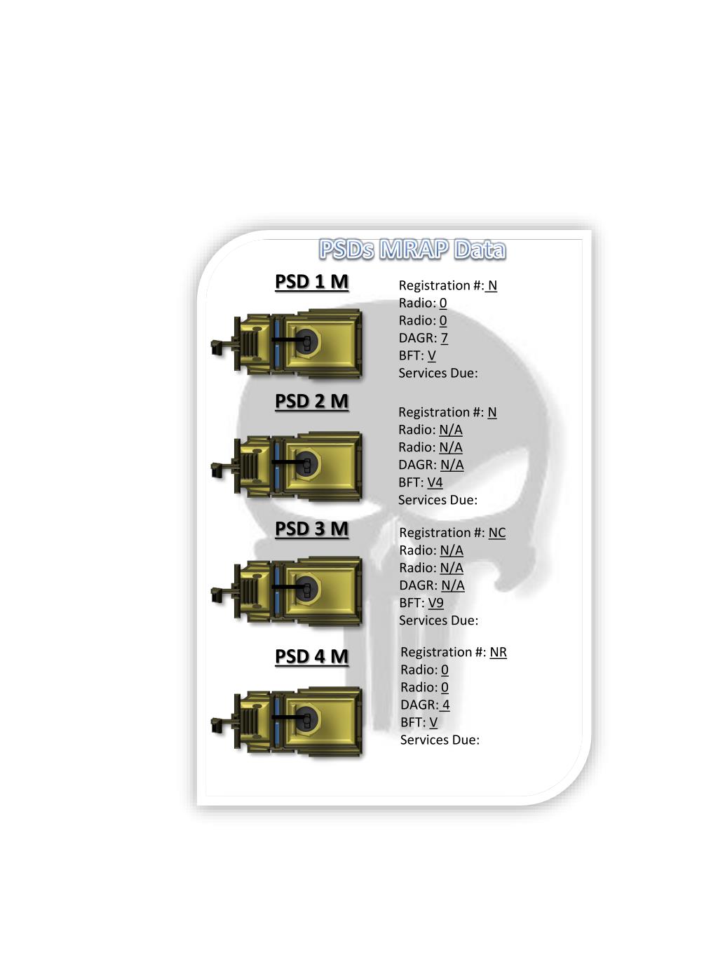 PSDs MRAP Data PSD 1 M Registration #:N Radio: 0 Radio: 0 DAGR: 7 BFT: V Services Due: PSD 2 M Registration #: N Radio: N/A Radio: N/A DAGR: N/A BFT: V4 Services Due: PSD 3 M Registration #: NC Radio: N/A Radio: N/A DAGR: N/A BFT: V9 Services Due: PSD 4 M Registration #: NR Radio: 0 Radio: 0 DAGR:4 BFT: V Services Due: