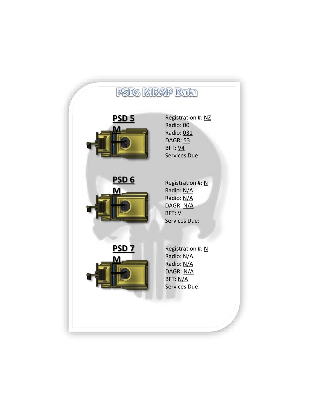 PSDs MRAP Data PSD 5 M Registration #: NZ Radio: 00 Radio: 031 DAGR: 53 BFT: V4 Services Due: PSD 6 M Registration #: N Radio: N/A Radio: N/A DAGR: N/A BFT: V Services Due: PSD 7 M Registration #: N Radio: N/A Radio: N/A DAGR: N/A BFT: N/A Services Due: