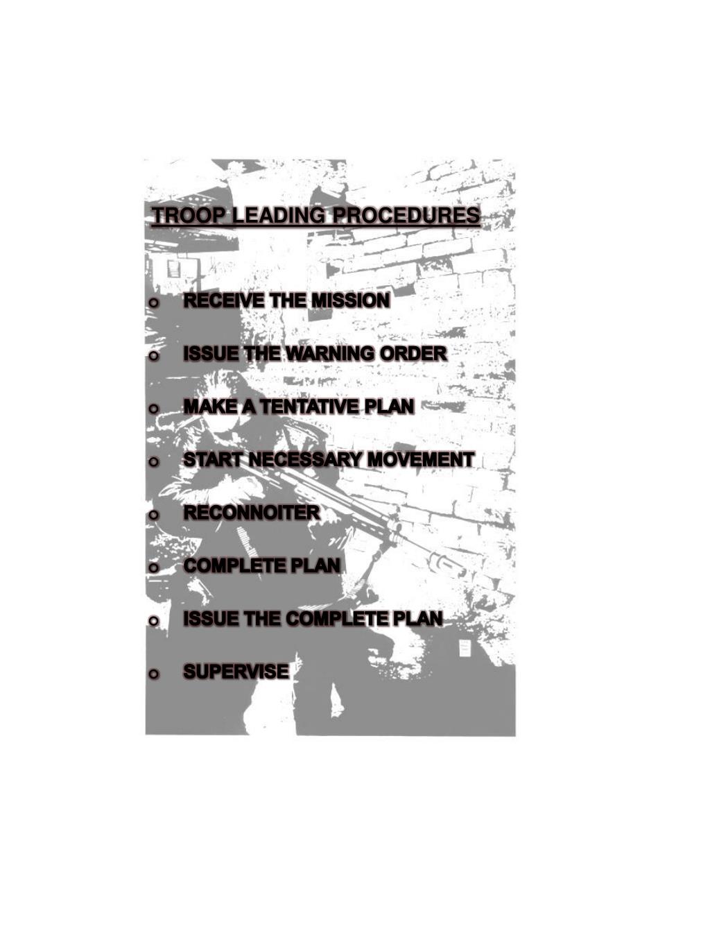 TROOP LEADING PROCEDURES • RECEIVE THE MISSION • ISSUE THE WARNING ORDER • MAKE A TENTATIVE PLAN • START NECESSARY MOVEMENT • RECONNOITER • COMPLETE PLAN • ISSUE THE COMPLETE PLAN • SUPERVISE