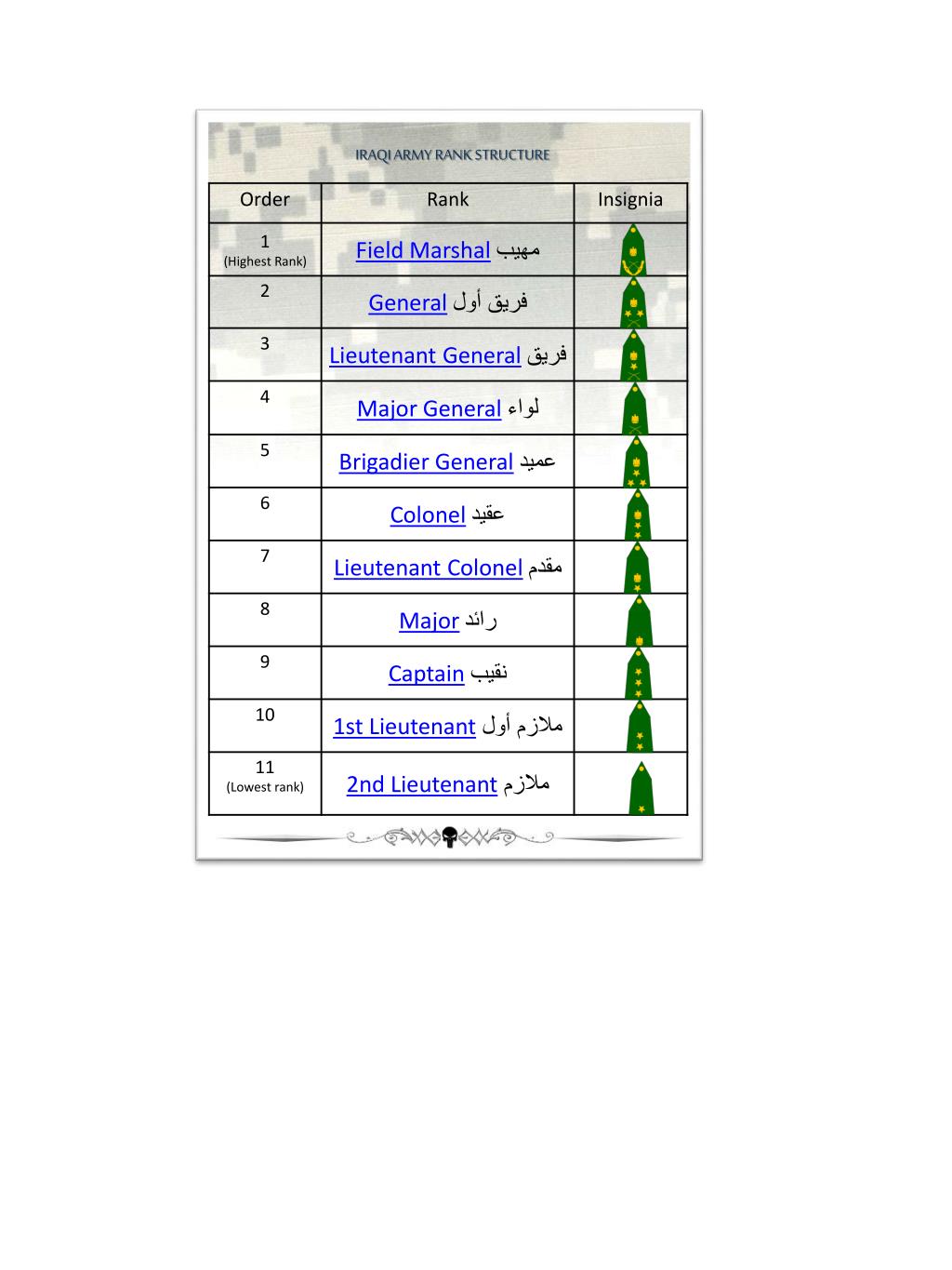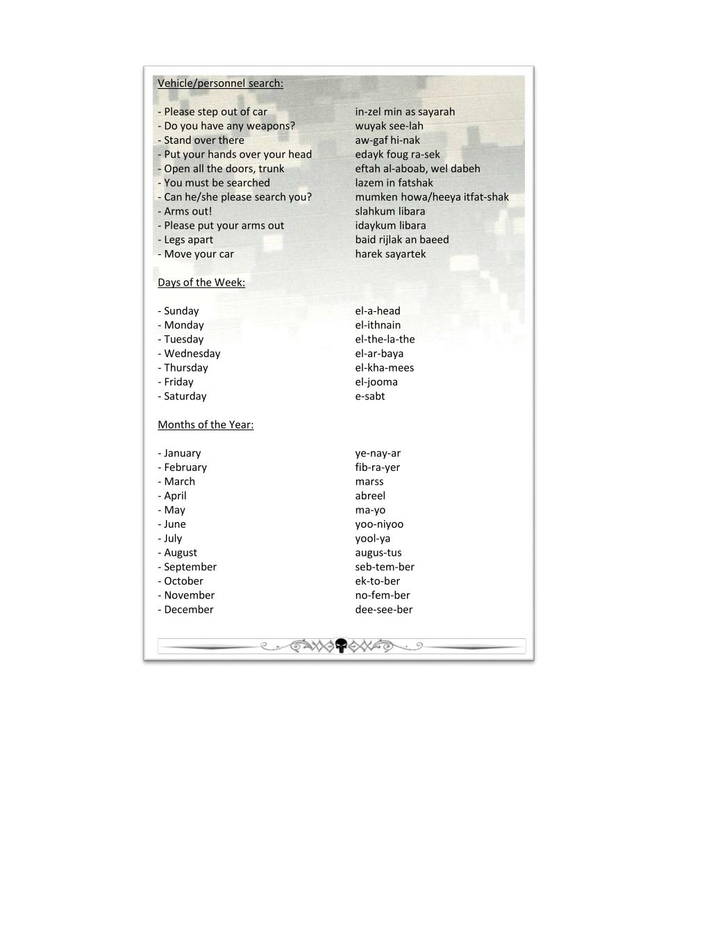 Vehicle/personnel search: • Please step out of car in-zel min as sayarah • Do you have any weapons? wuyak see-lah • Stand over there aw-gaf hi-nak • Put your hands over your head edaykfougra-sek • Open all the doors, trunk eftah al-aboab, weldabeh • You must be searched lazem in fatshak • Can he/she please search you? mumkenhowa/heeyaitfat-shak • Arms out! slahkumlibara • Please put your arms out idaykumlibara • Legs apart baidrijlak an baeed • Move your car hareksayartek • Days of the Week: • Sunday el-a-head • Monday el-ithnain • Tuesday el-the-la-the • Wednesday el-ar-baya • Thursday el-kha-mees • Friday el-jooma • Saturday e-sabt • Months of the Year: • January ye-nay-ar • February fib-ra-yer • March marss • April abreel • May ma-yo • June yoo-niyoo • July yool-ya • August augus-tus • September seb-tem-ber • October ek-to-ber • November no-fem-ber • December dee-see-ber