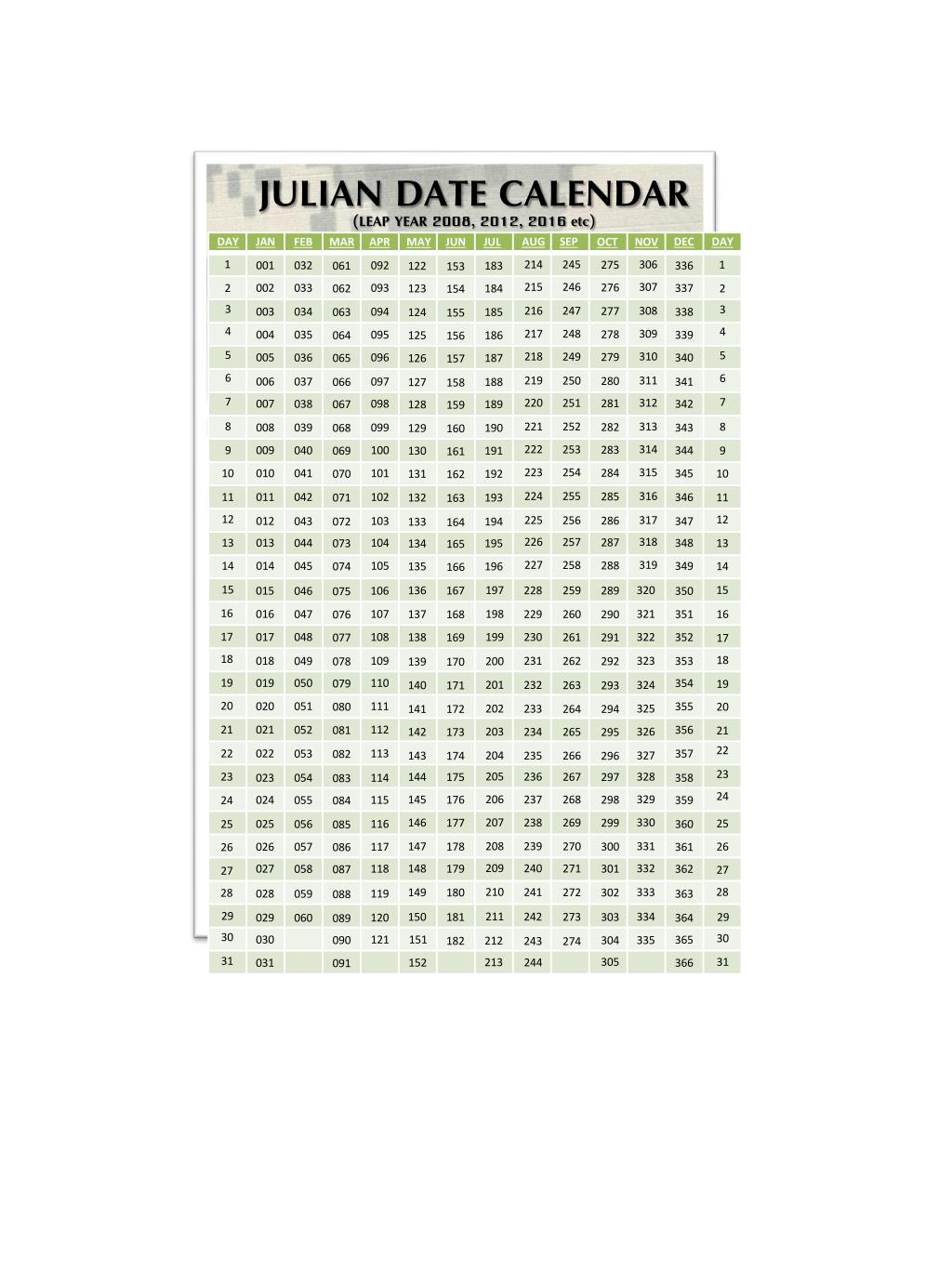 JULIAN DATE CALENDAR (LEAP YEAR 2008, 2012, 2016 etc) DEC JAN AUG DAY DAY SEP FEB APR JUN OCT MAR MAY JUL NOV 1 214 306 245 1 275 001 092 032 336 061 183 122 153 215 307 246 276 002 093 033 337 2 062 184 123 2 154 3 3 216 308 247 277 003 094 034 338 063 185 124 155 4 4 217 309 248 278 004 095 035 339 064 186 125 156 5 5 218 310 249 279 005 096 036 340 065 187 126 157 6 6 219 311 250 280 006 097 037 341 066 188 127 158 7 7 220 312 251 281 007 098 038 342 067 189 128 159 8 221 313 252 8 282 008 099 039 343 068 190 129 160 222 314 253 283 9 009 100 040 344 9 069 191 130 161 223 315 254 284 10 010 101 041 345 10 070 192 131 162 224 316 255 285 11 011 102 042 346 11 071 193 132 163 12 12 225 317 256 286 012 103 043 347 072 194 133 164 226 318 257 287 13 013 104 044 348 13 073 195 134 165 227 319 258 288 14 014 105 045 349 14 074 196 135 166 15 15 197 320 228 136 259 167 289 015 106 046 350 075 16 198 321 016 107 229 047 16 137 260 351 168 290 076 17 199 322 017 108 230 048 138 261 352 169 291 077 17 18 18 323 018 109 231 049 262 353 292 200 078 139 170 19 019 110 050 354 079 19 201 324 232 140 263 171 293 20 020 111 051 355 080 20 202 325 233 141 264 172 294 21 021 112 052 356 081 21 203 326 234 142 265 173 295 22 22 022 113 053 357 082 204 327 235 143 266 174 296 23 205 23 328 236 144 267 175 297 023 114 054 358 083 24 206 329 237 145 268 176 298 024 115 055 359 24 084 207 330 238 146 269 177 299 25 025 116 25 056 360 085 208 331 239 147 270 26 178 300 026 117 057 361 26 086 209 332 240 148 271 179 301 027 118 058 362 087 27 27 28 210 333 241 149 272 180 302 28 028 119 059 363 088 29 211 334 242 150 273 181 303 29 029 120 060 364 089 30 30 151 030 121 365 090 335 304 212 182 243 274 31 305 31 213 244 152 031 366 091
